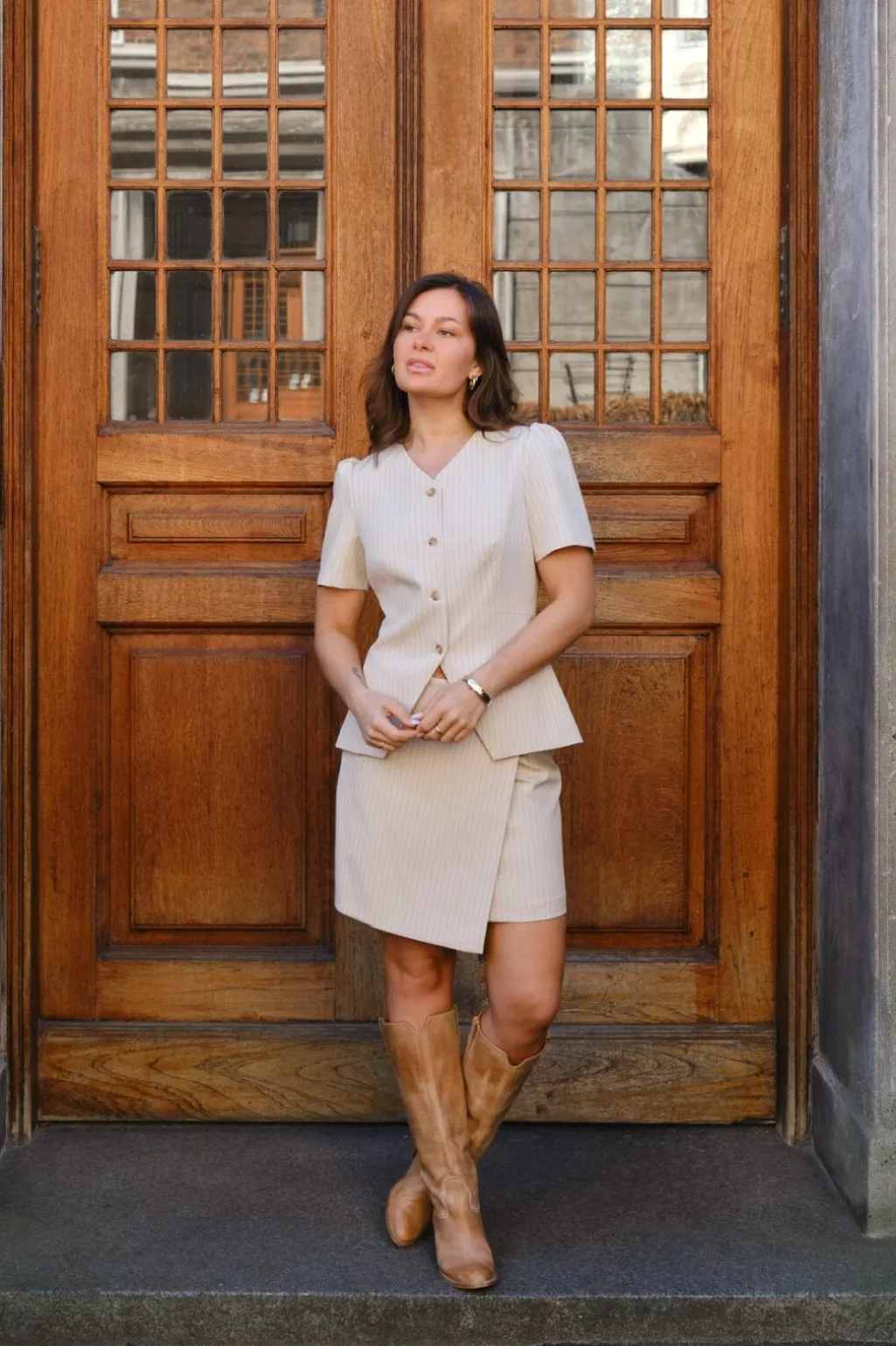 Sandfarvet bluse fra Neo Noir med striber. Den har v-hals, korte pufærmer og knapper hele vejen ned foran. Dekorative syninger fremhæver det stribede design.