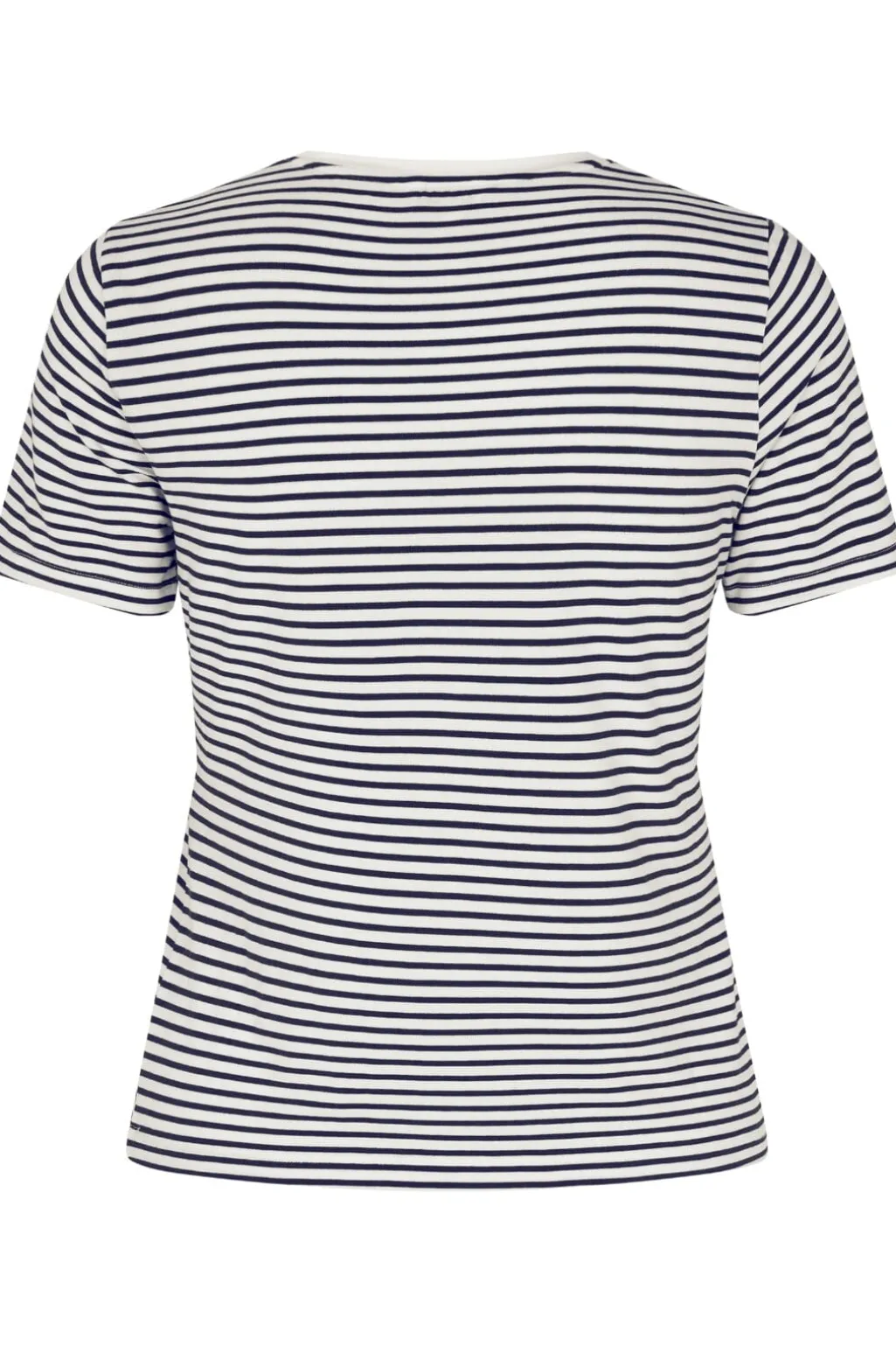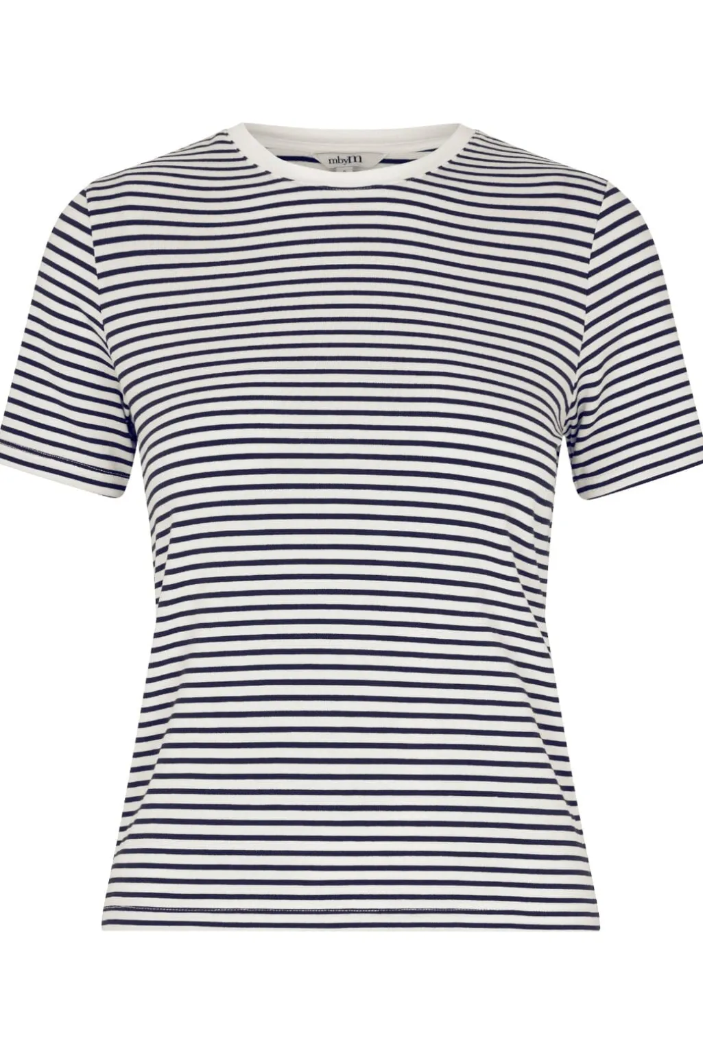 Stribet t-shirt fra MbyM med vandrette navy og hvide striber. Den har rund halsudskæring og korte ærmer. Det maritime stribemønster giver et rent og klassisk udtryk.