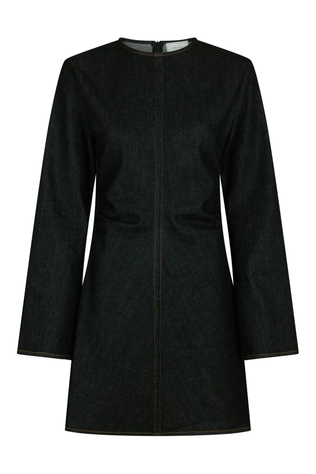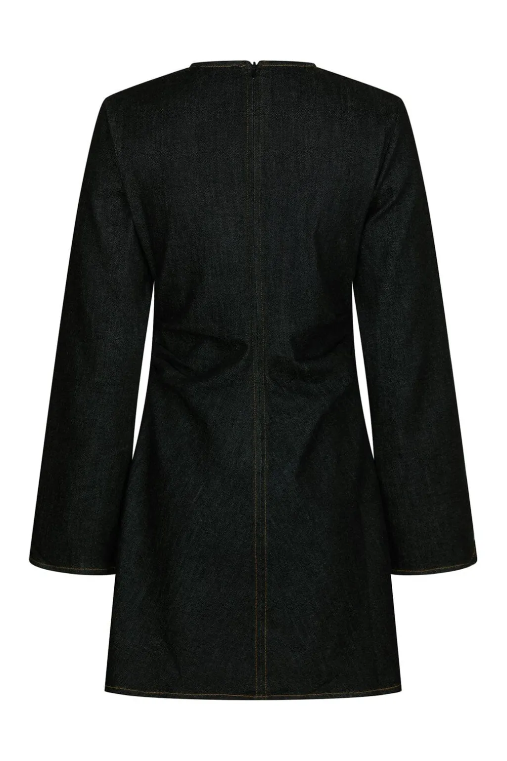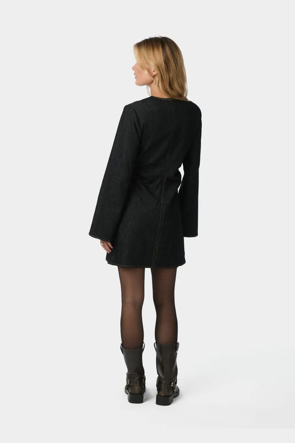 Sort denimkjole fra Neo Noir med en tætsiddende pasform og lange ærmer med vidde. Kjolen har rund hals og lynlås i ryggen.