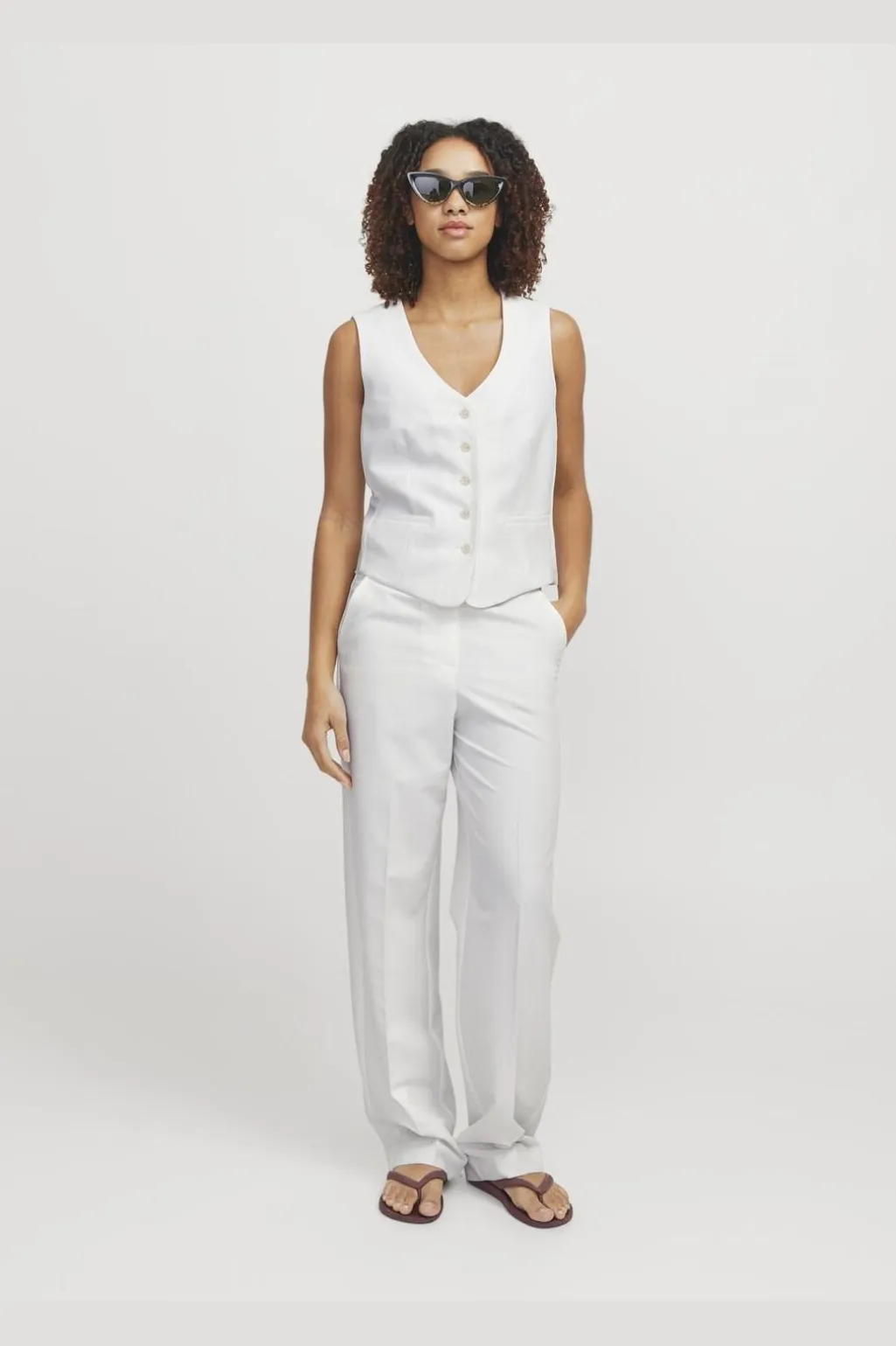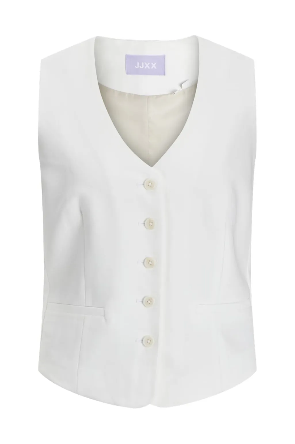 Hvid vest fra Jjxx med V-halsudskæring og knaplukning. Vesten er lavet af twill og har et klassisk design med fem knapper foran og to praktiske forlommer.