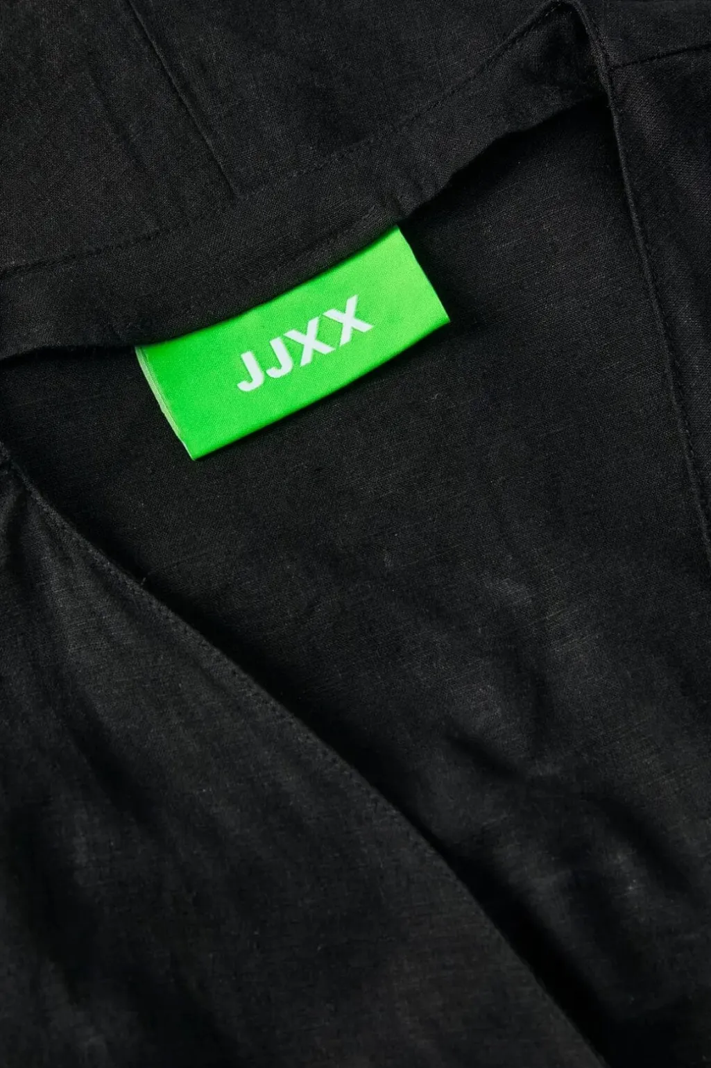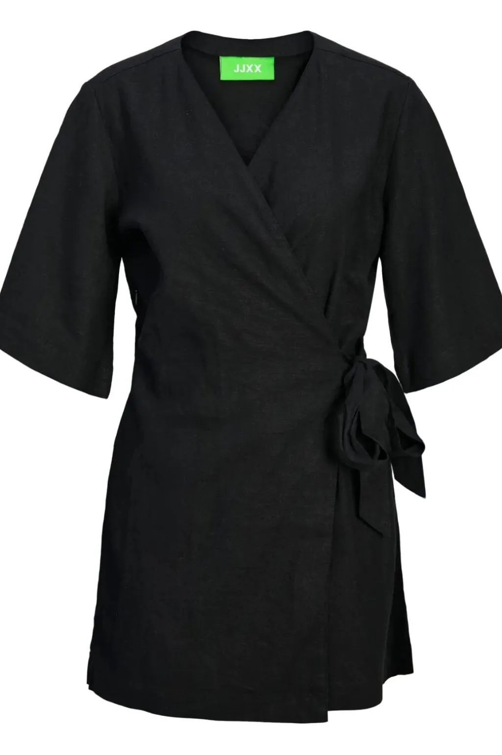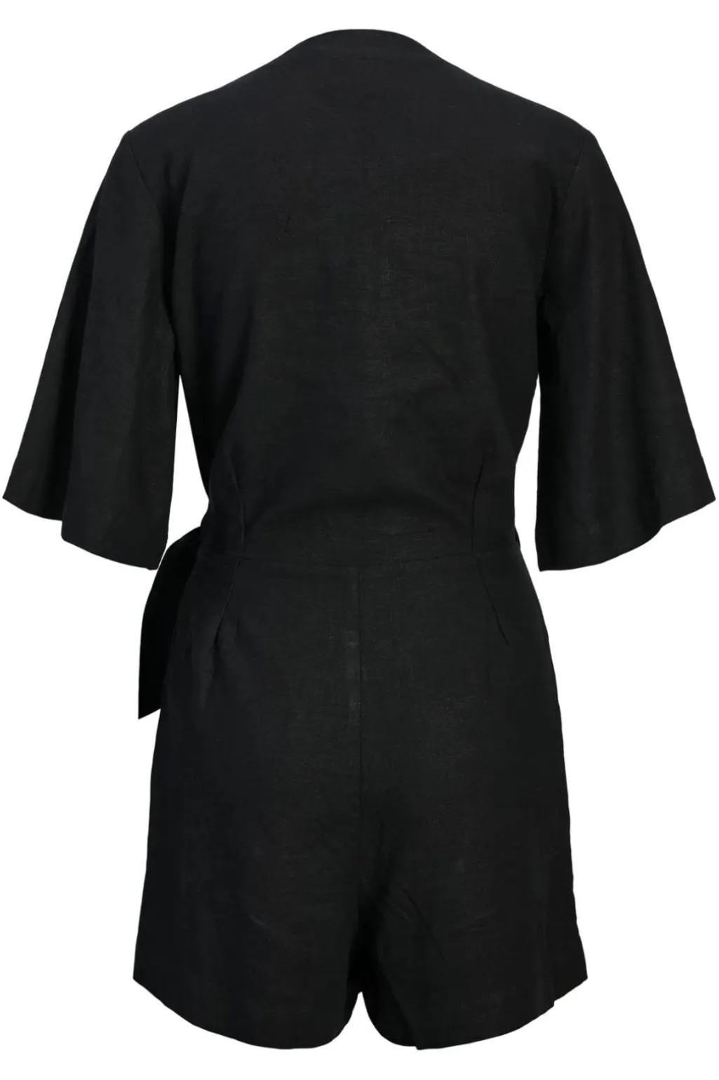 Sort playsuit fra Jjxx med V-udskæring og bindebånd i taljen. Den har korte ærmer og et indpakningsdesign, der giver en god pasform. Forlommerne gør den praktisk til hverdagsbrug.