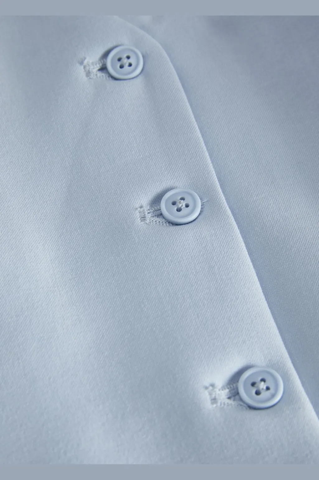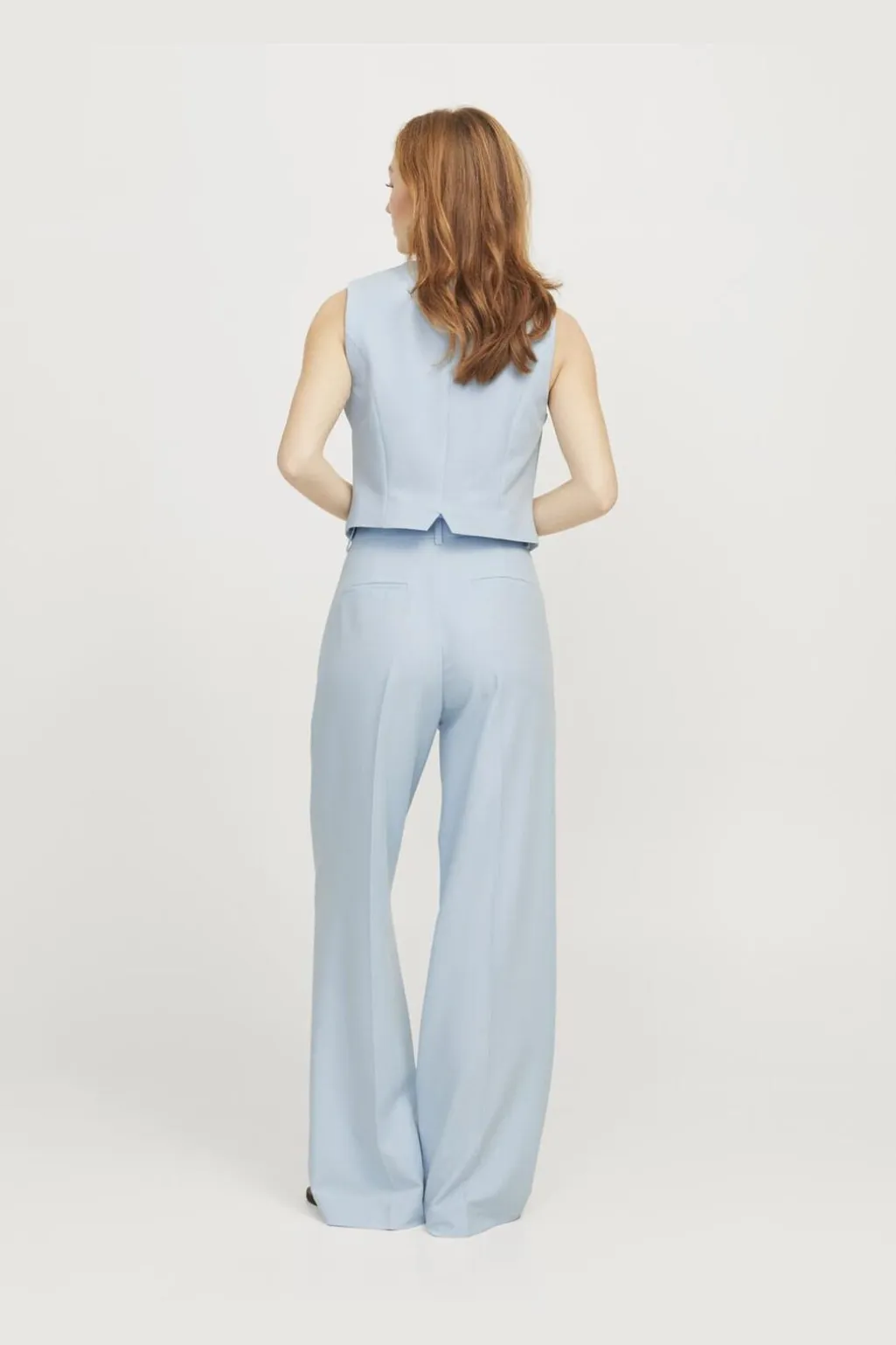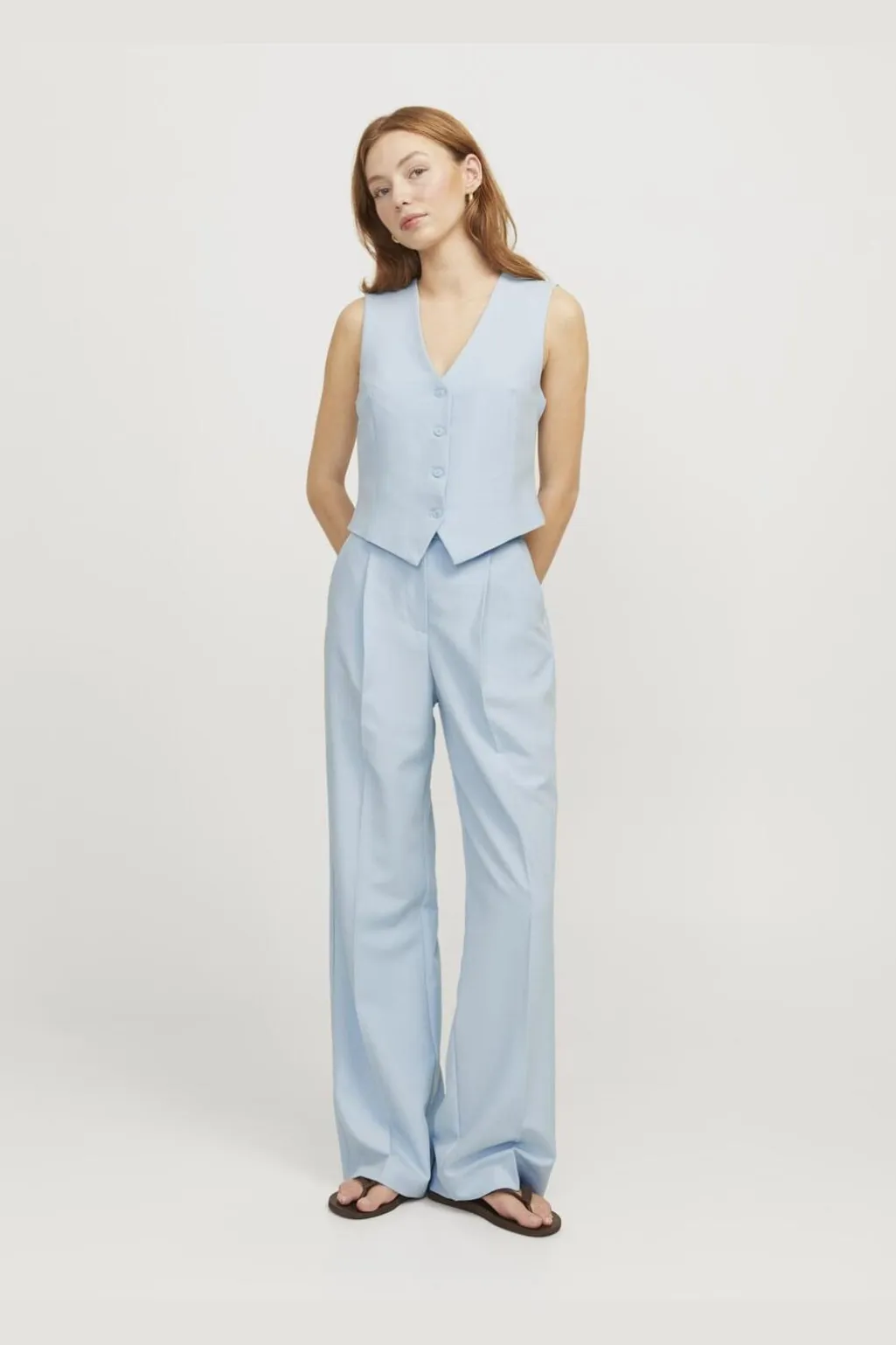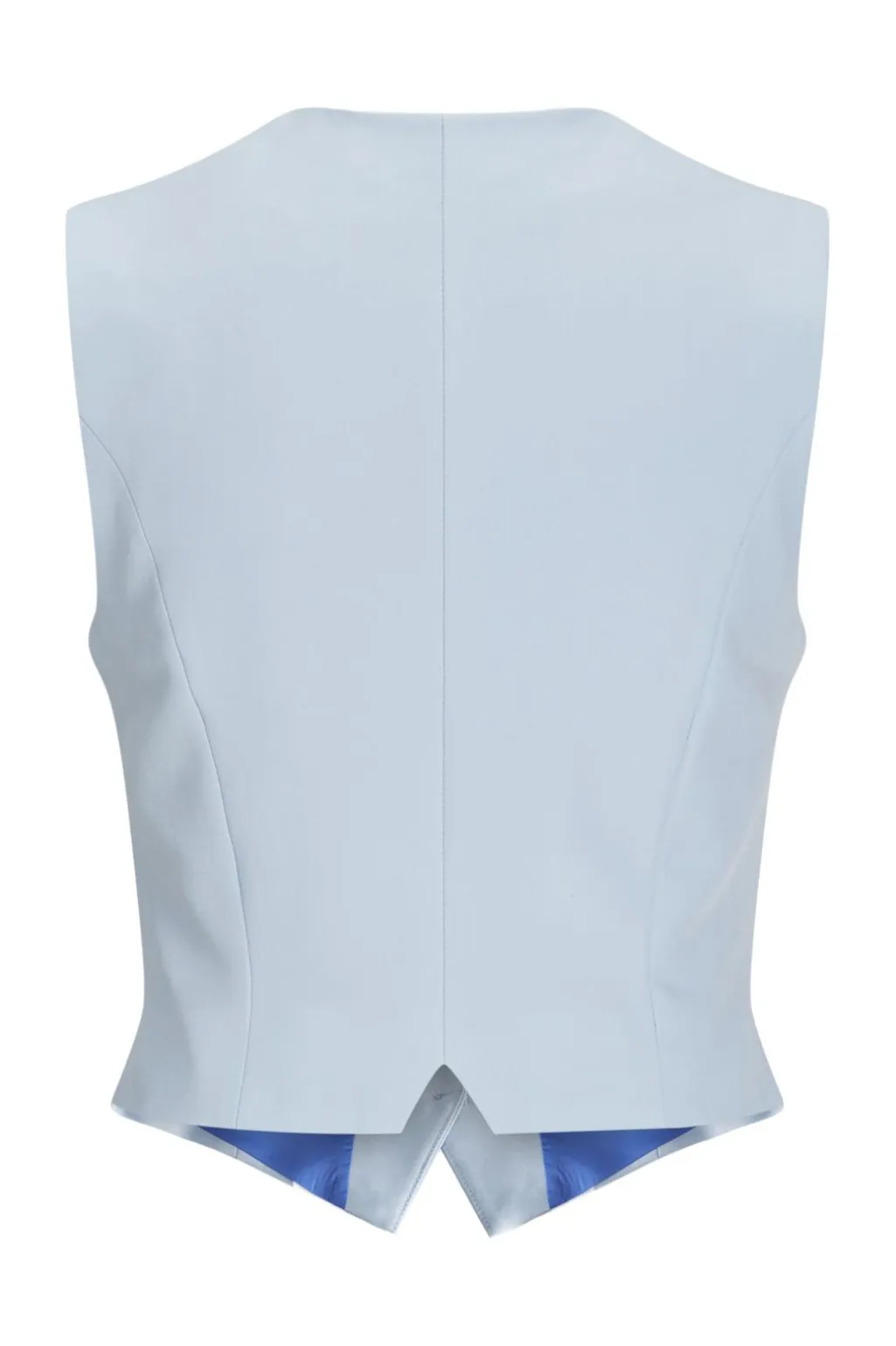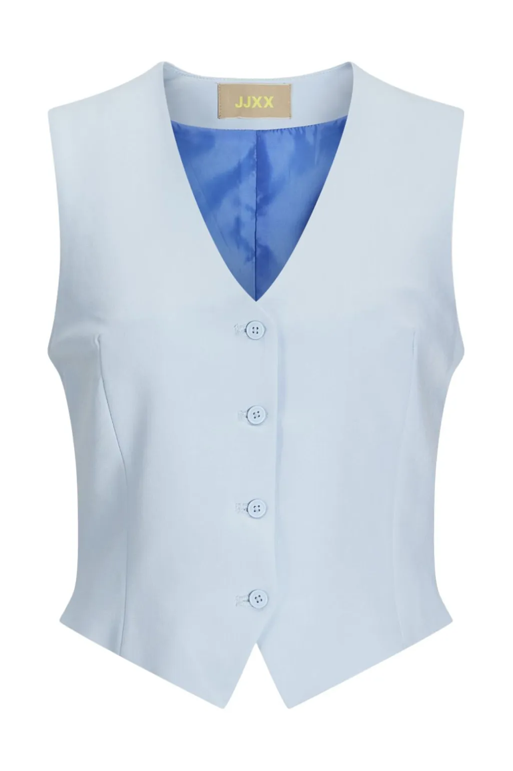 Lyseblå vest fra Jjxx med fiskebensmønster. Den har V-hals, knaplukning foran og er fuldt foret. Vesten er fremstillet i twill med et karakteristisk V-mønster.