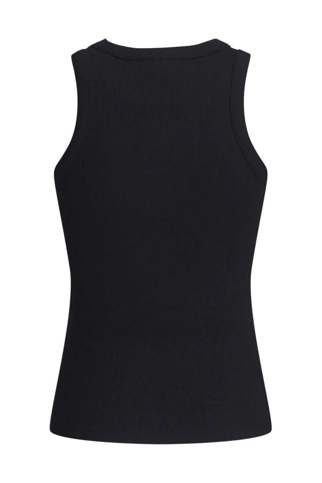 Sort ribstrikket top fra Jjxx med tætsiddende pasform. Toppen har rund halsudskæring og er uden ærmer, hvilket gør den nem at style med forskellige lag.