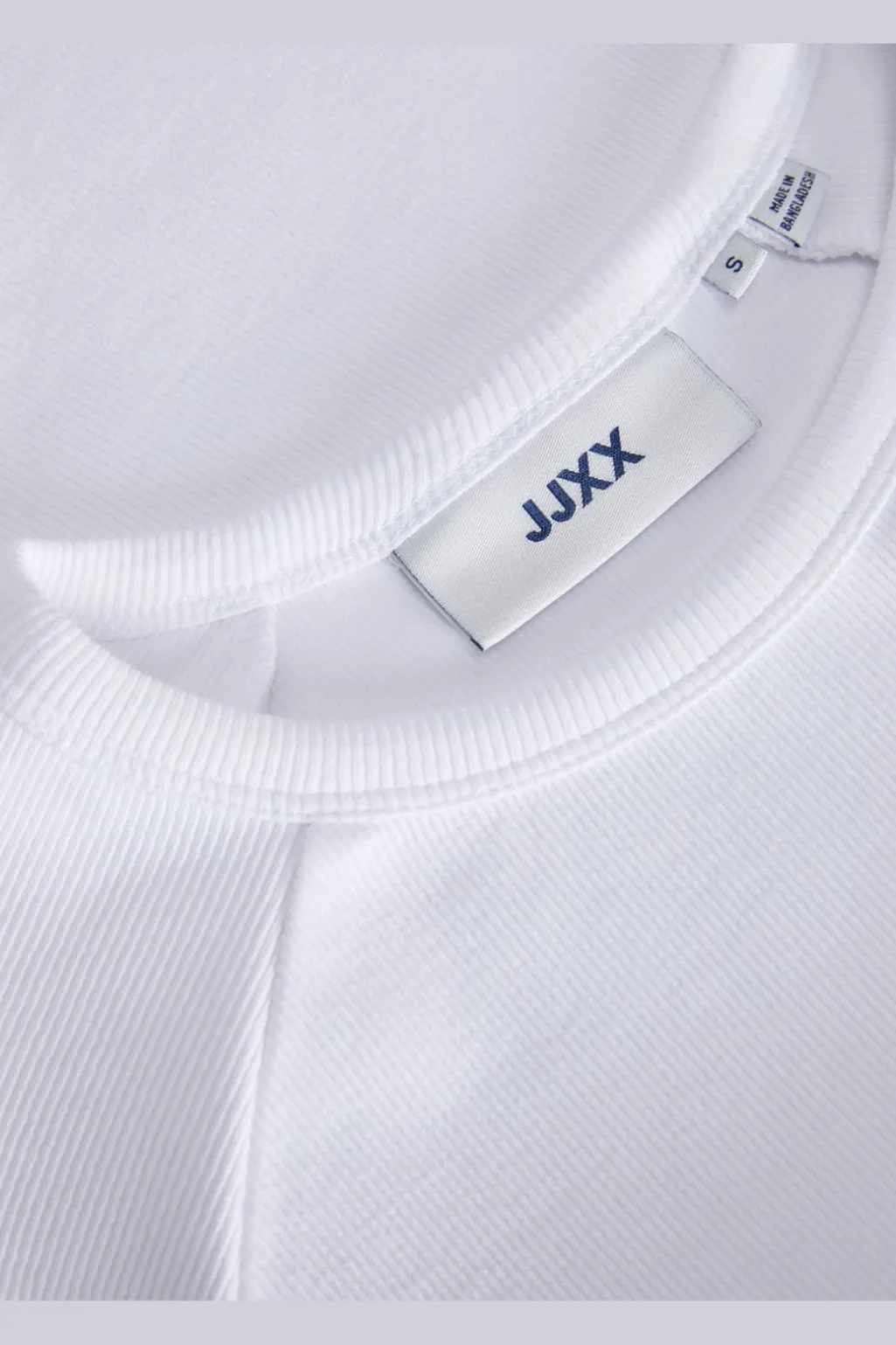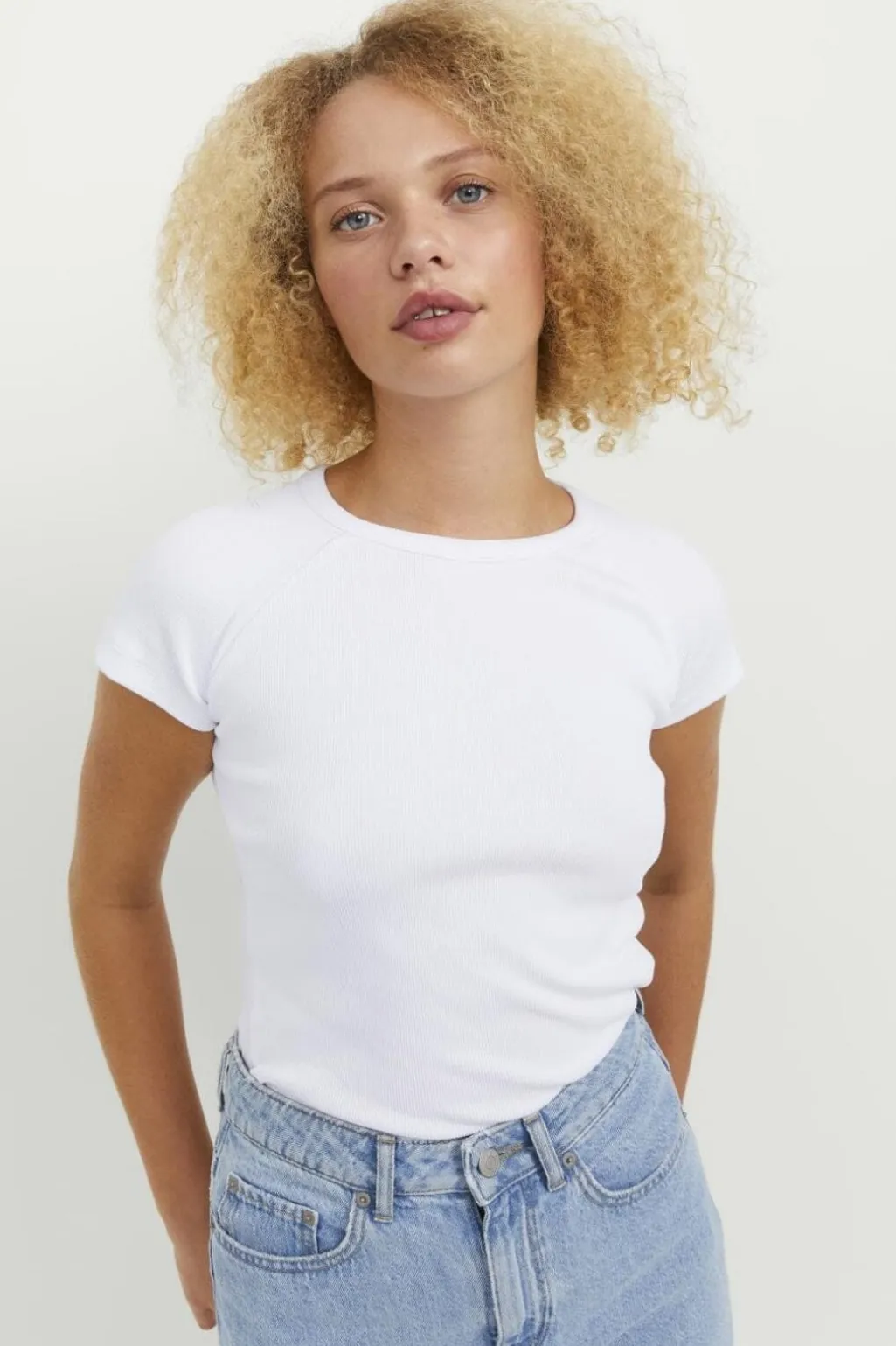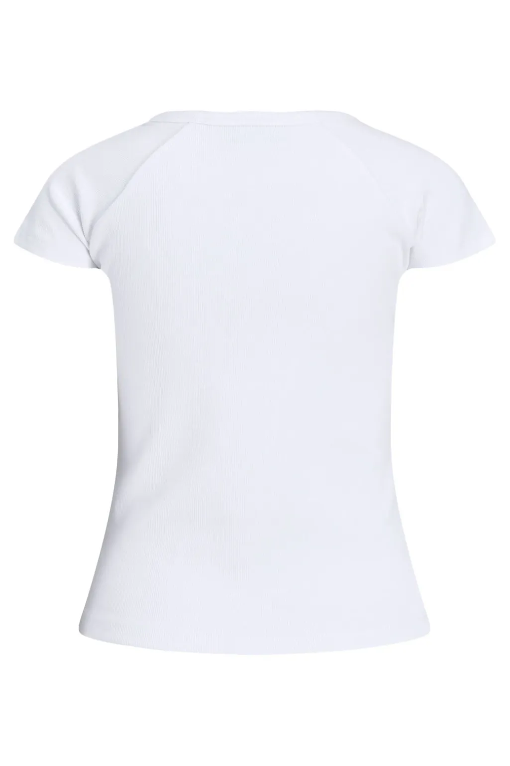 Hvid ribstrikket t-shirt fra Jjxx med tætsiddende pasform. T-shirten har en ribbet struktur, rund halsudskæring og korte ærmer.