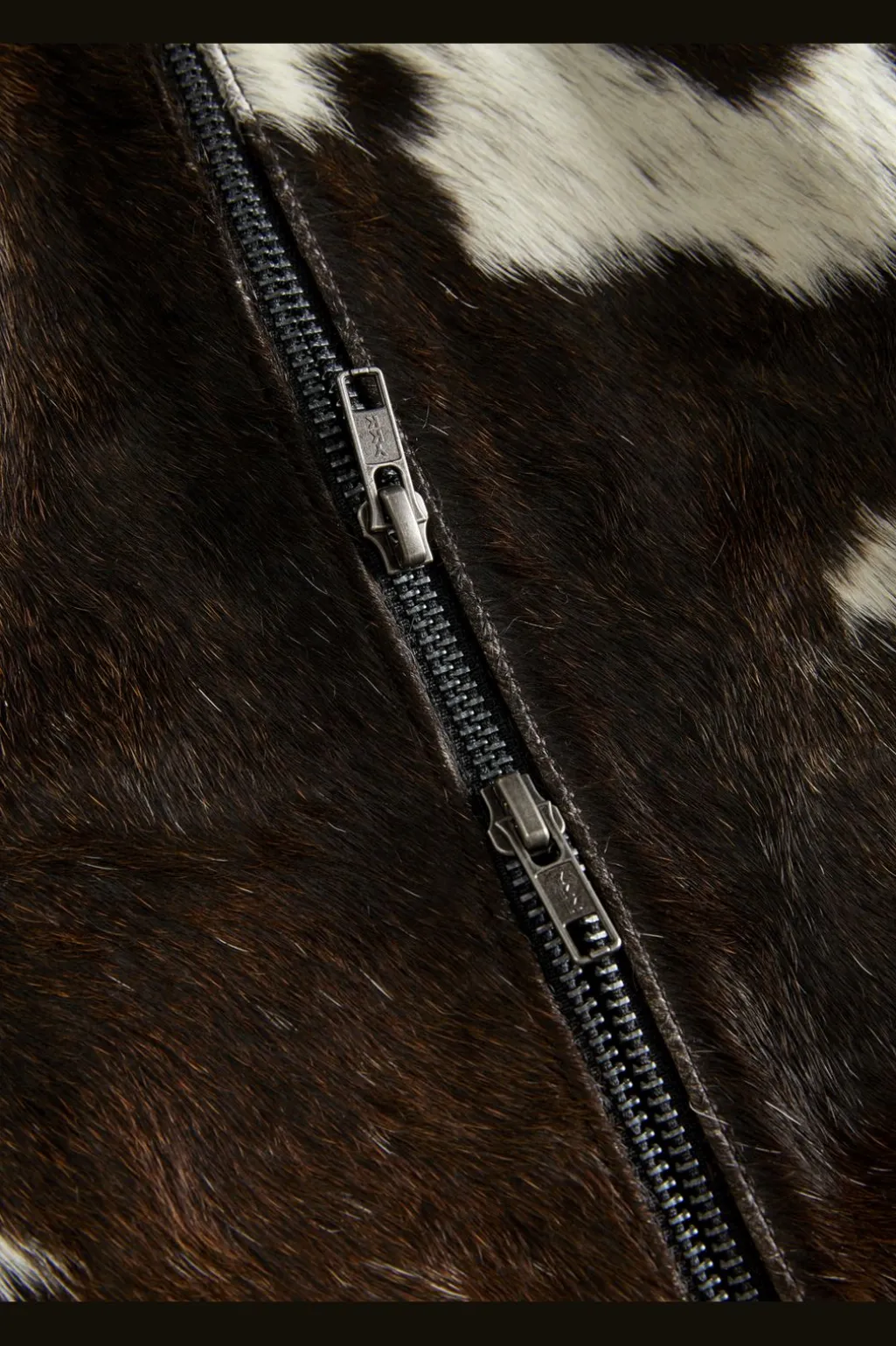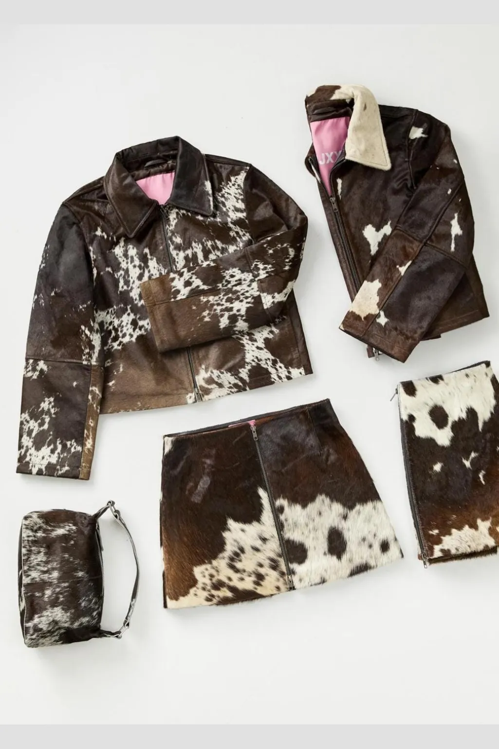 Kort lædernederdel fra Jjxx i hvid med brunt ko-print. Nederdelen er fremstillet af ægte læder med et karakteristisk mønster og har en praktisk lynlås-lukning.