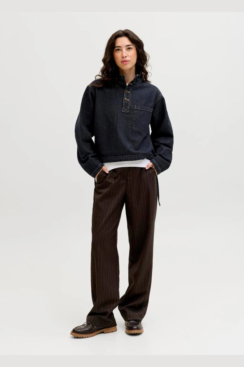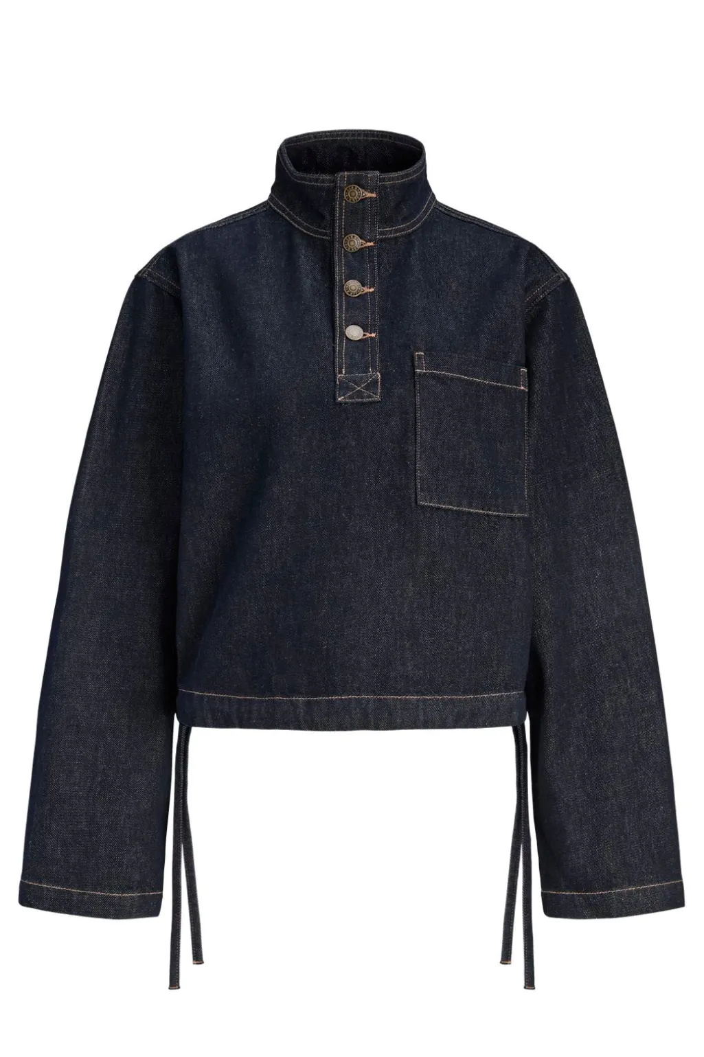 Denim-pullover fra Jjxx i mørkeblå denim med høj krave og halv knaplukning. Den har en loose fit-pasform og brystlomme på forsiden. Snore i taljen giver mulighed for at justere pasformen.
