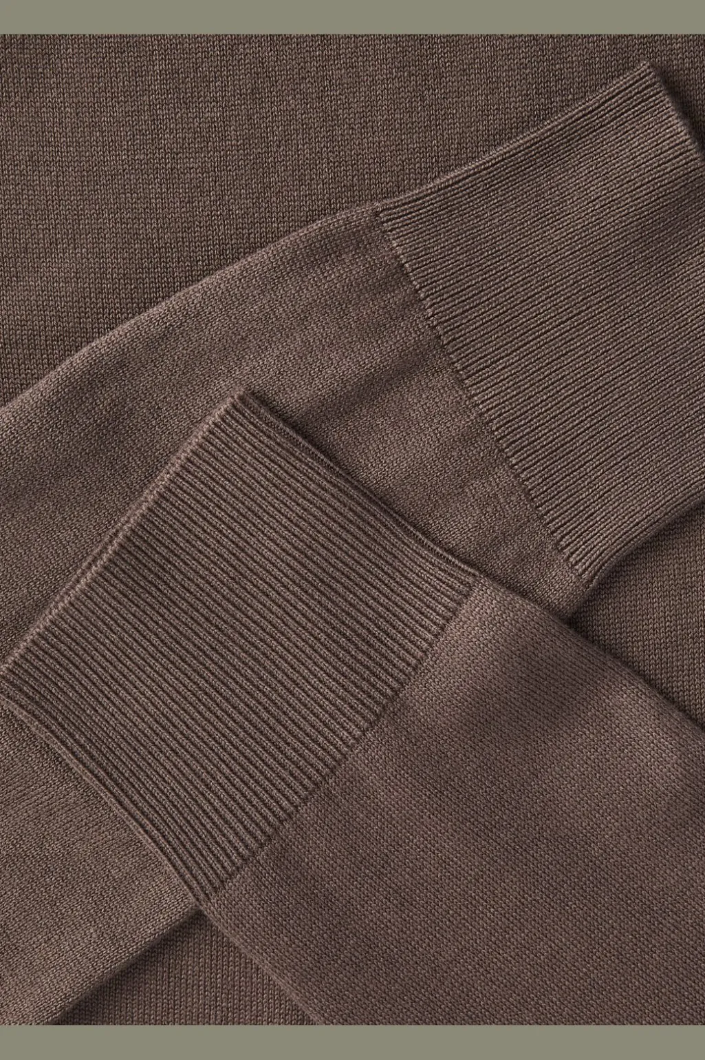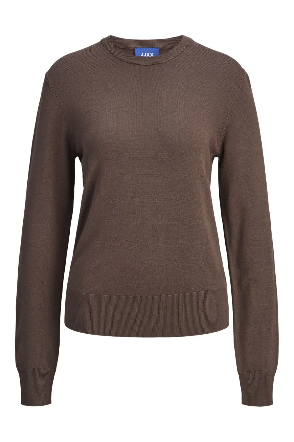 Brun striktrøje fra Jjxx i fladstrik. Trøjen har en rund halsudskæring og lange ærmer med ribkant ved håndleddene og nederste kant.