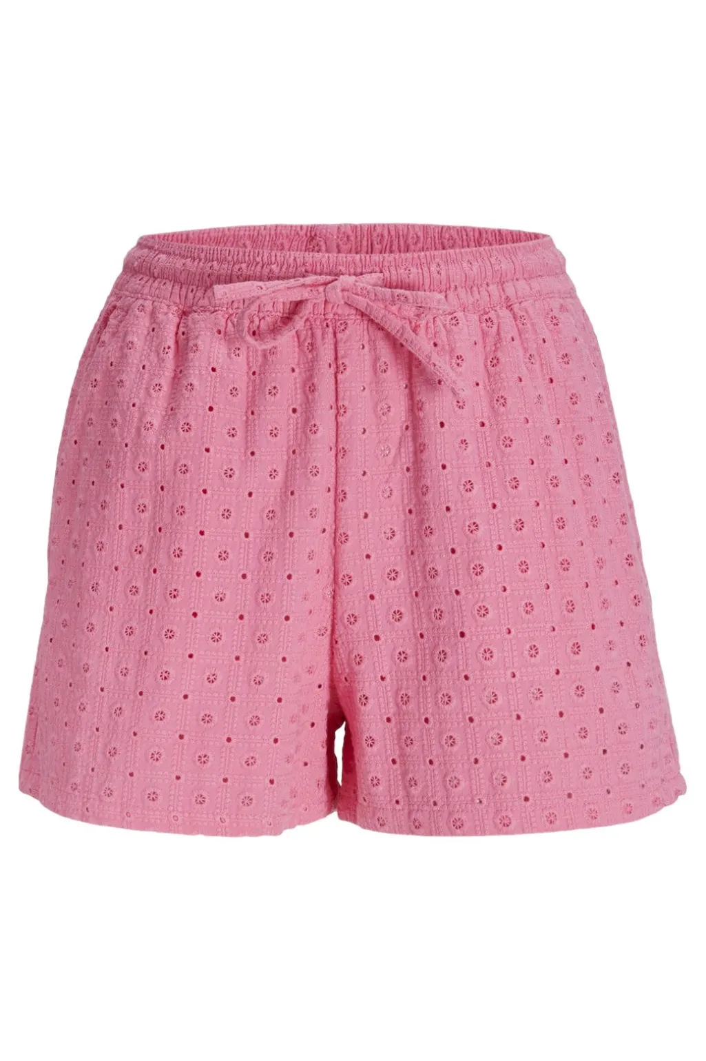 Lyserøde shorts fra Jjxx med broderie anglaise-mønster. Shortsene har en løs pasform og små blomsterhuller i stoffet, der giver et sommerligt udtryk.