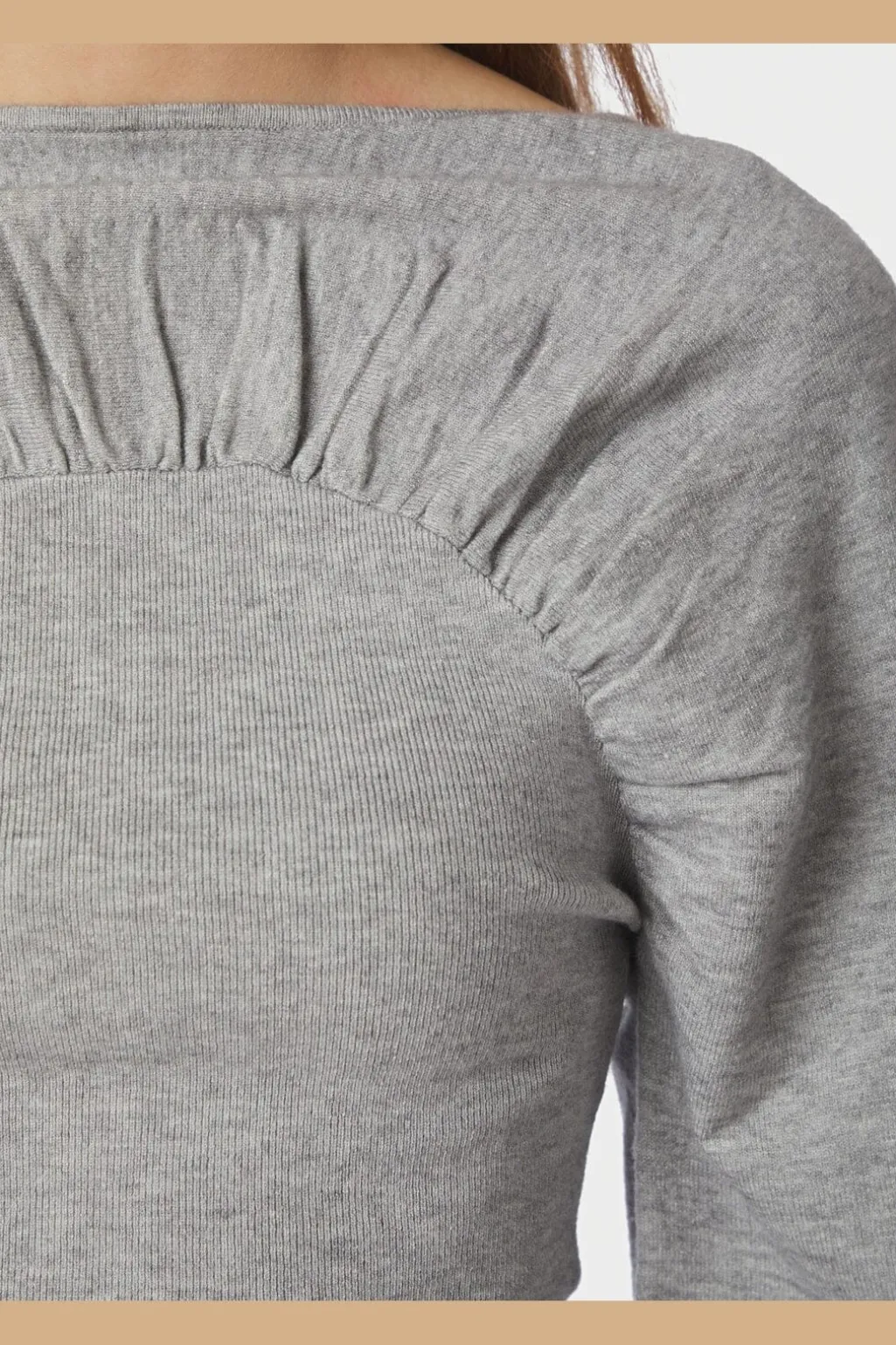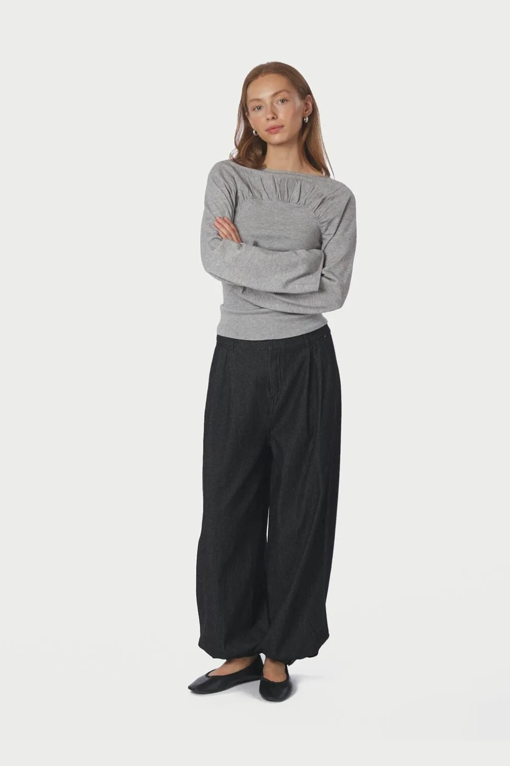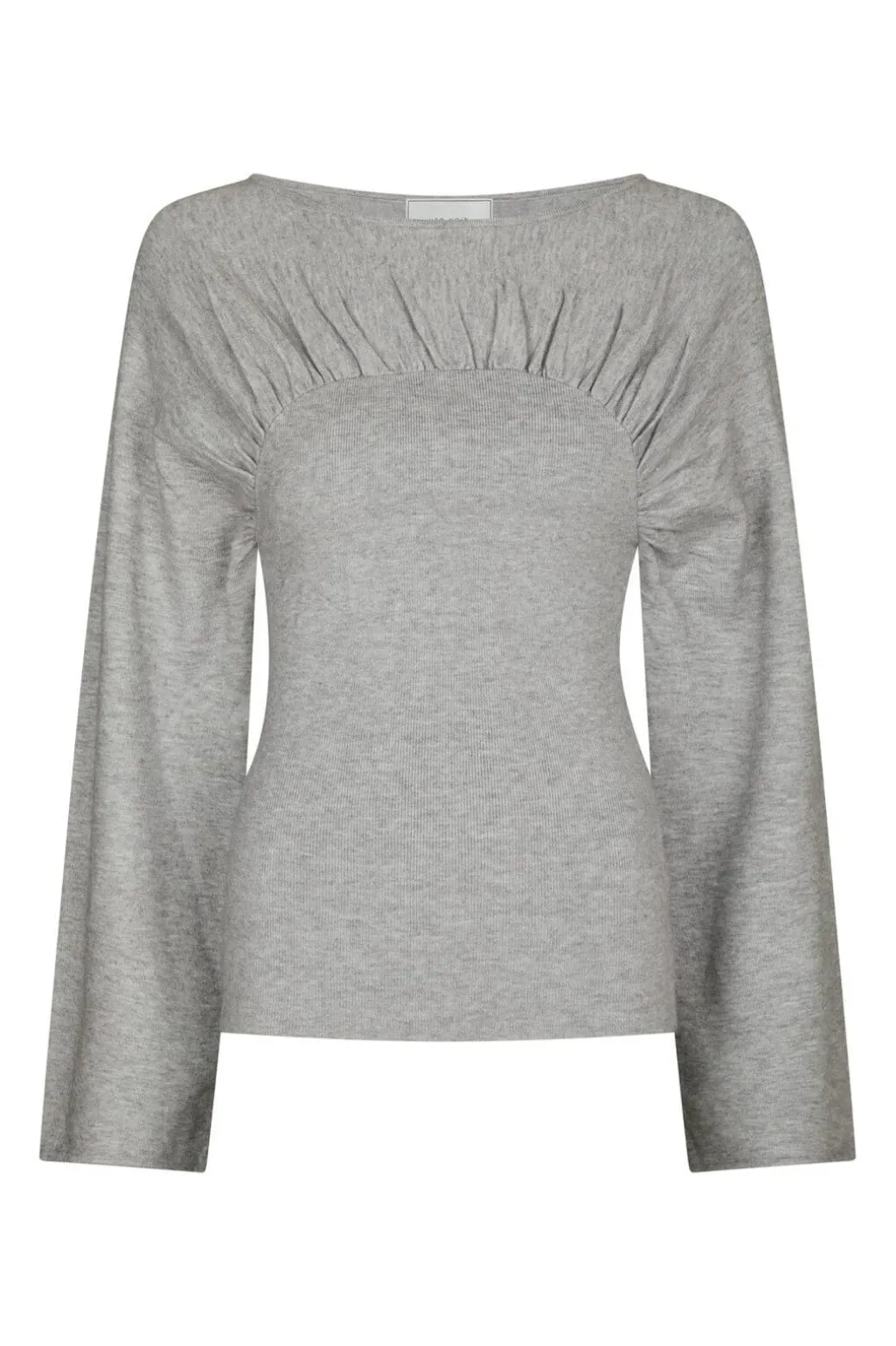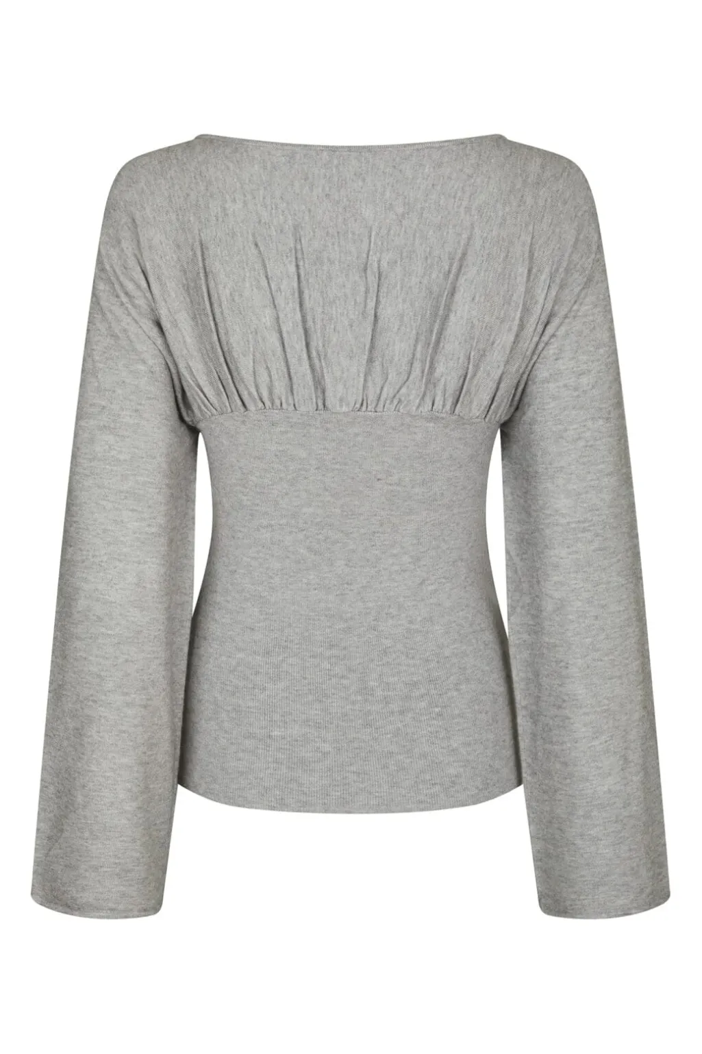 Strikbluse fra Neo Noir i lys grå melange. Blusen har rynkedetaljer ved brystet og ryggen samt lange, løse ærmer.