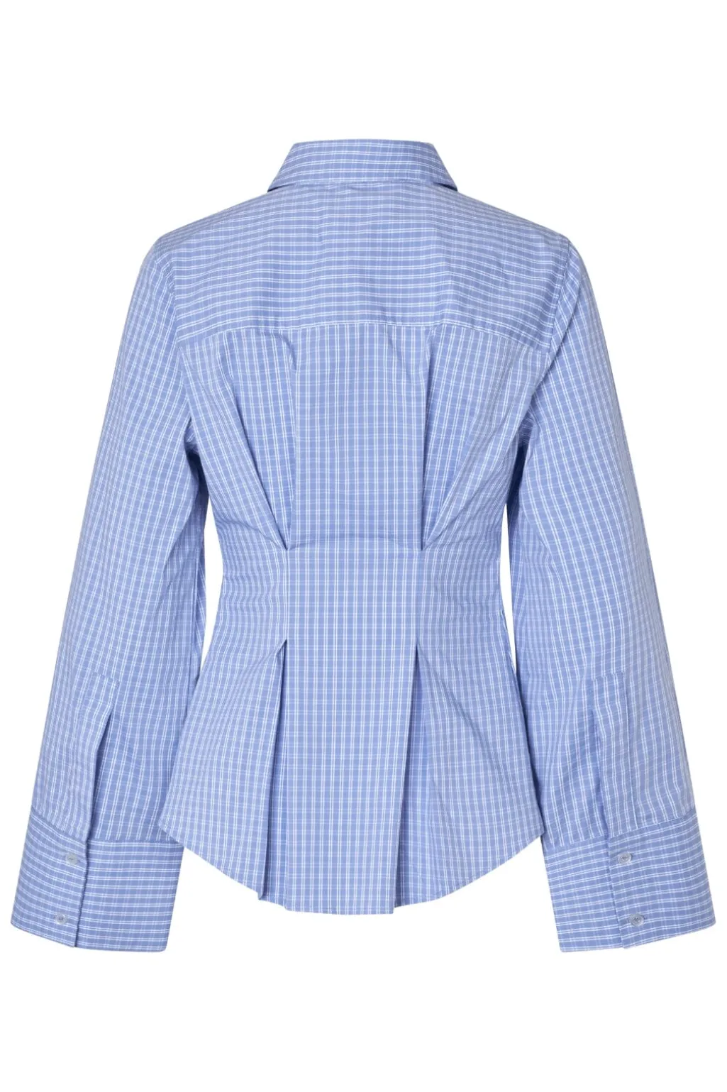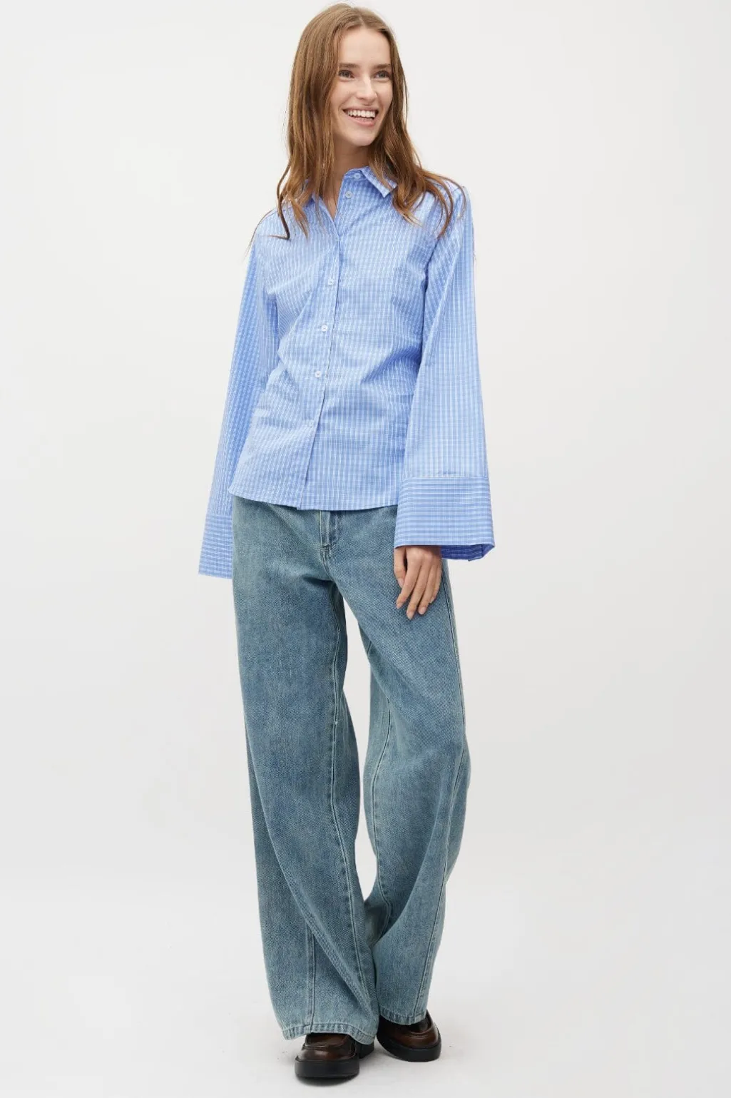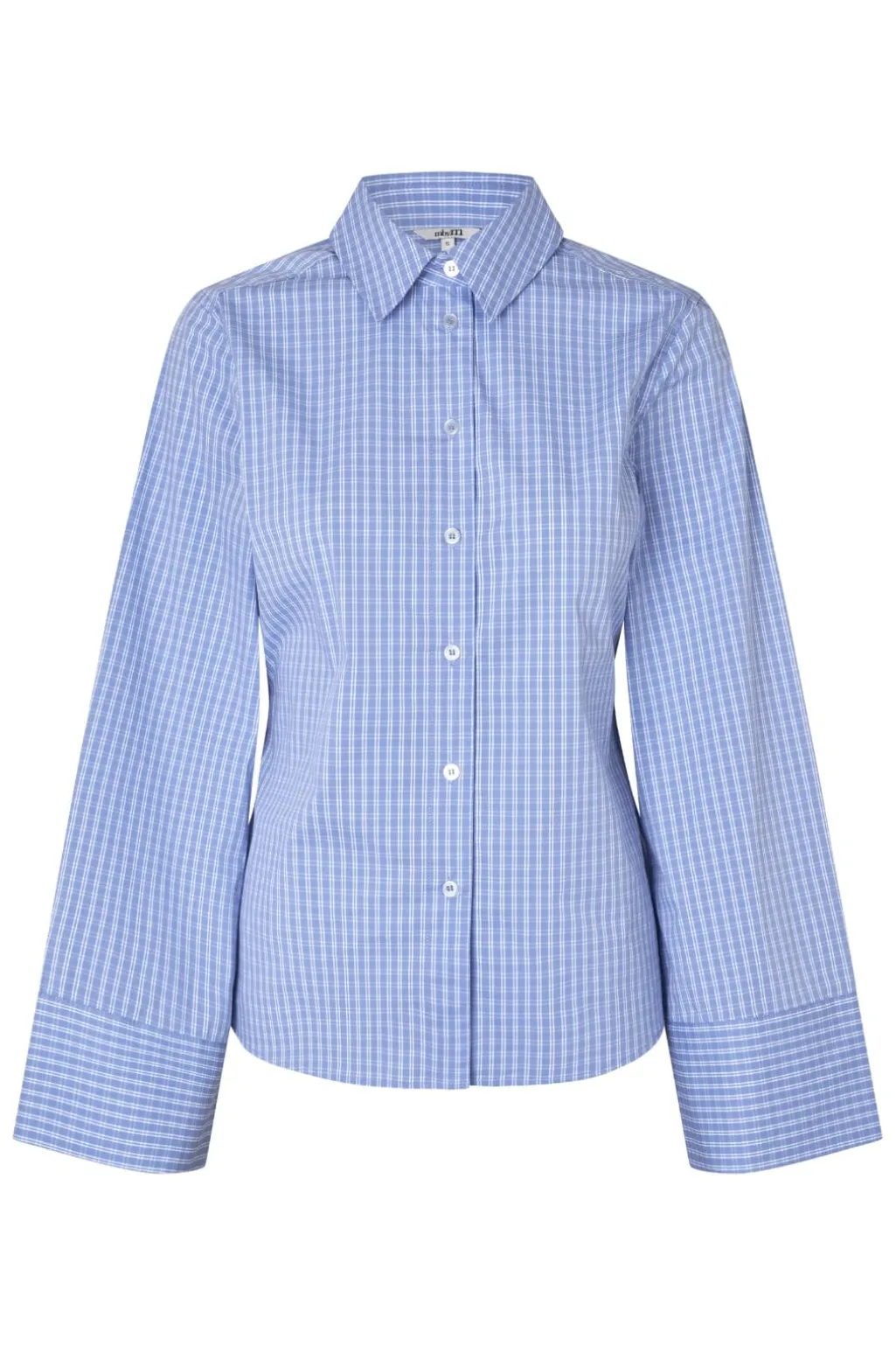 Ternet skjorte fra MbyM i blå og hvid. Skjorten har lange ærmer, knaplukning og dekorative syninger.