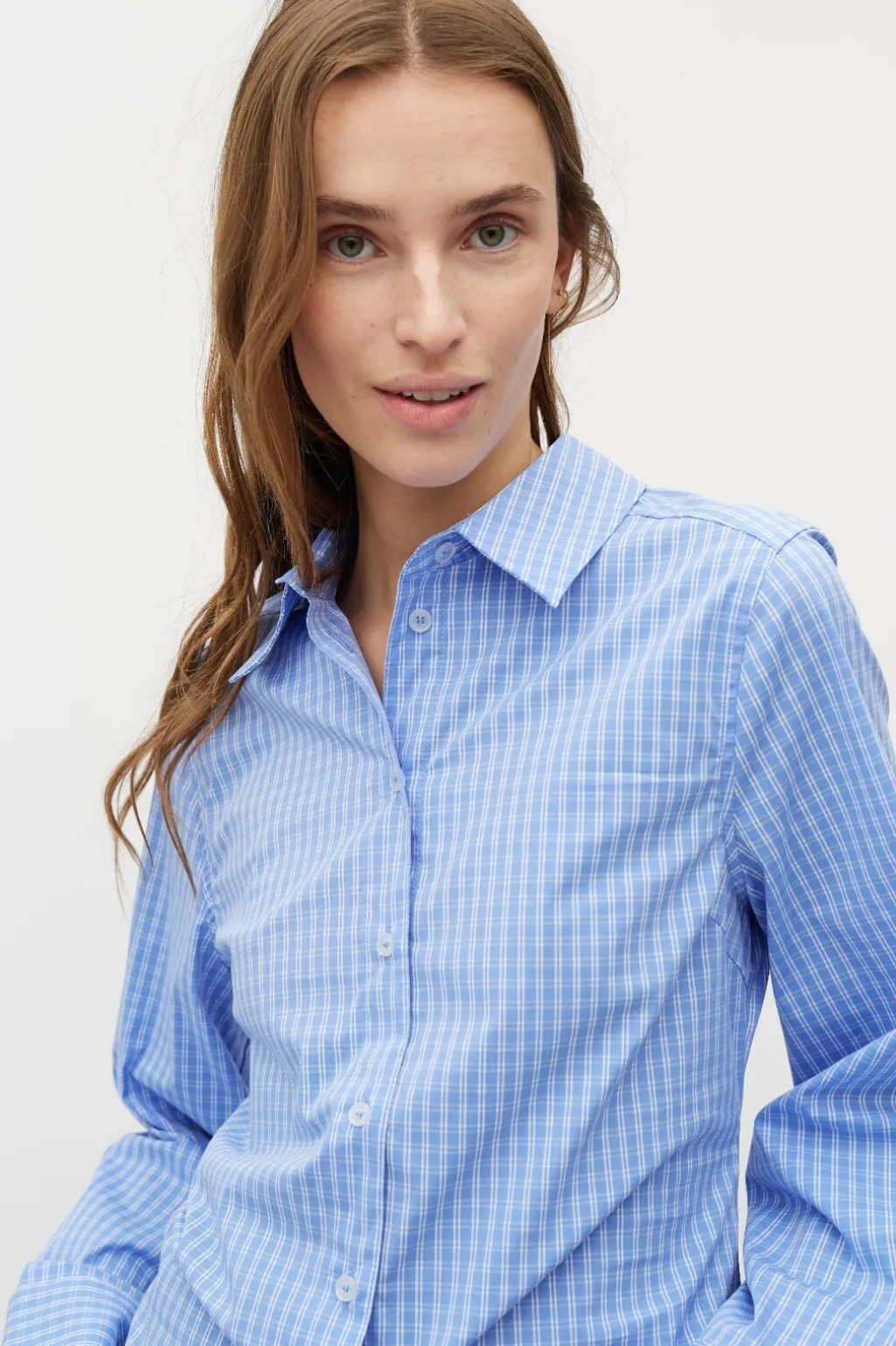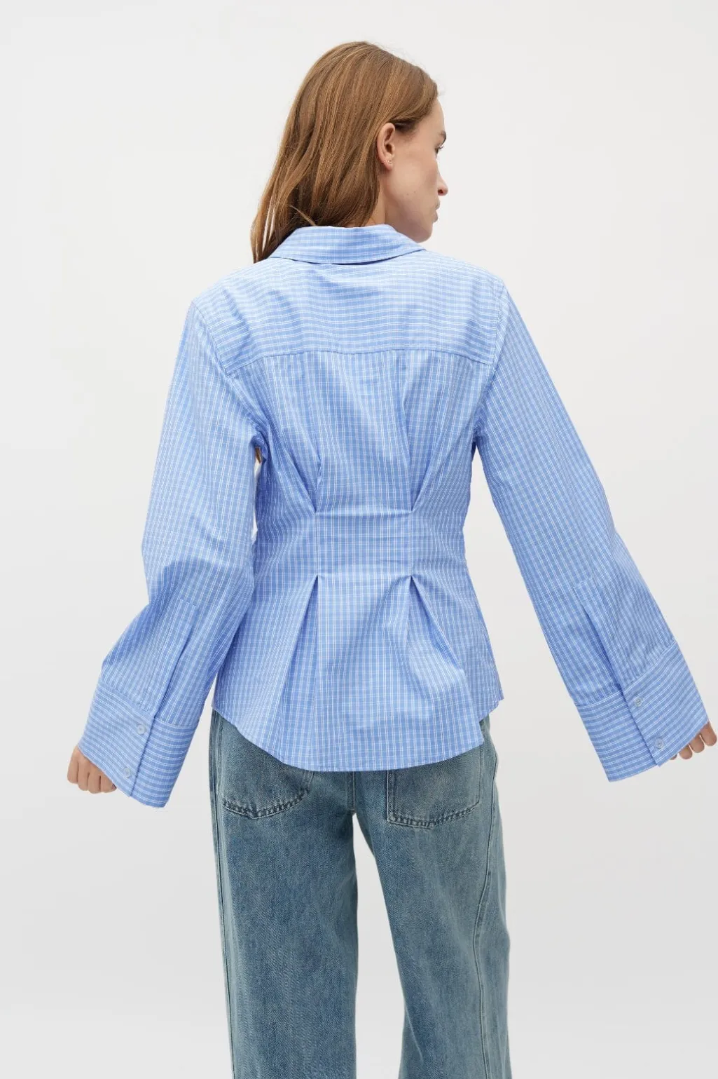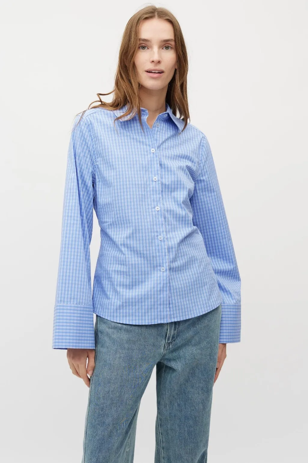 Ternet skjorte fra MbyM i blå og hvid. Skjorten har lange ærmer, knaplukning og dekorative syninger.