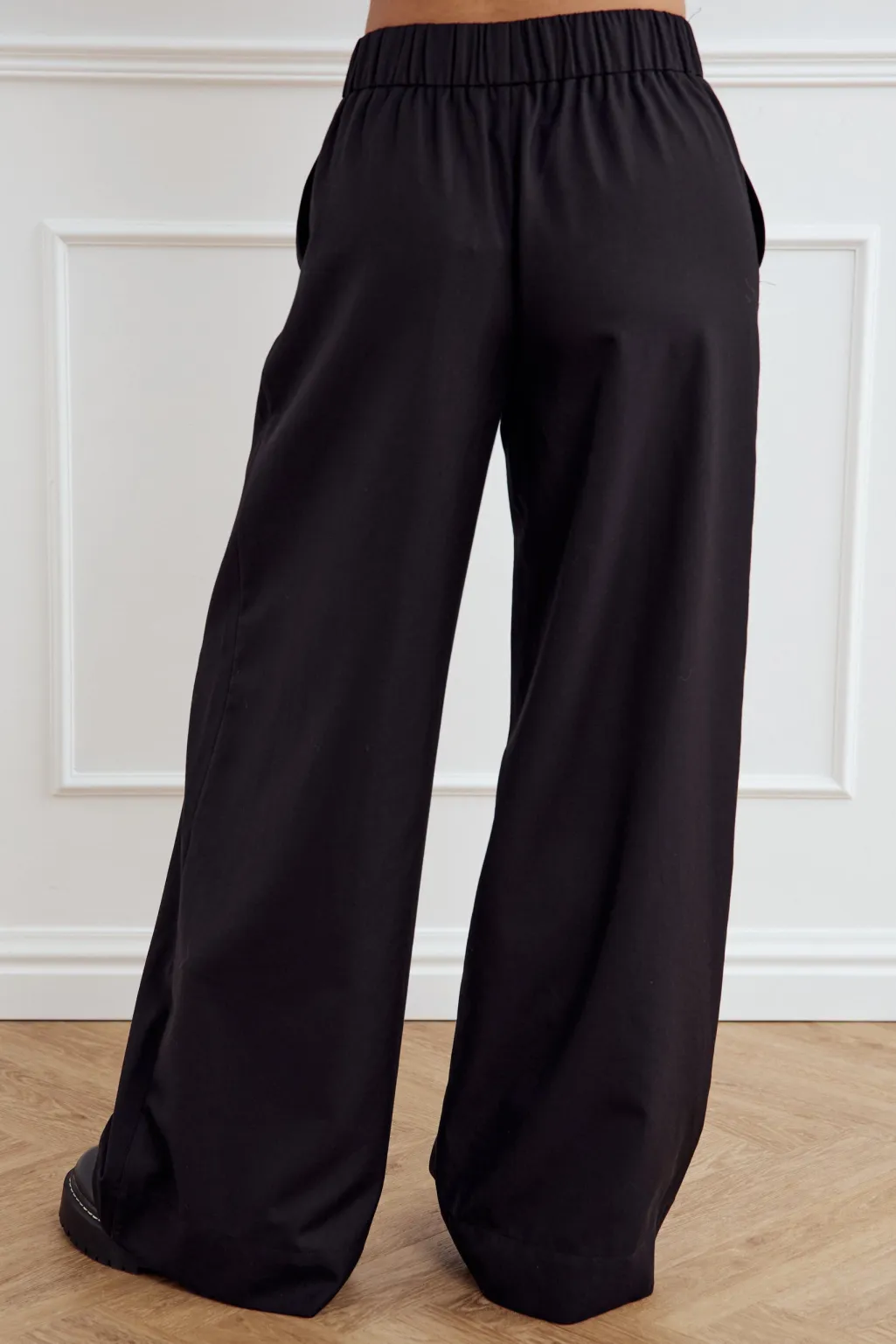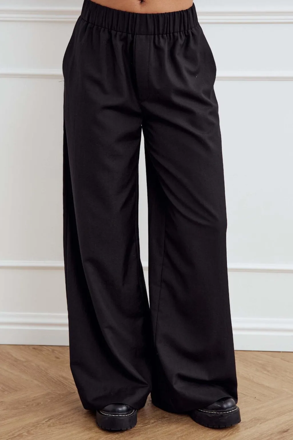Sorte bukser fra Noella med høj talje og løs pasform. Bukserne har elastikbånd i taljen og brede ben.