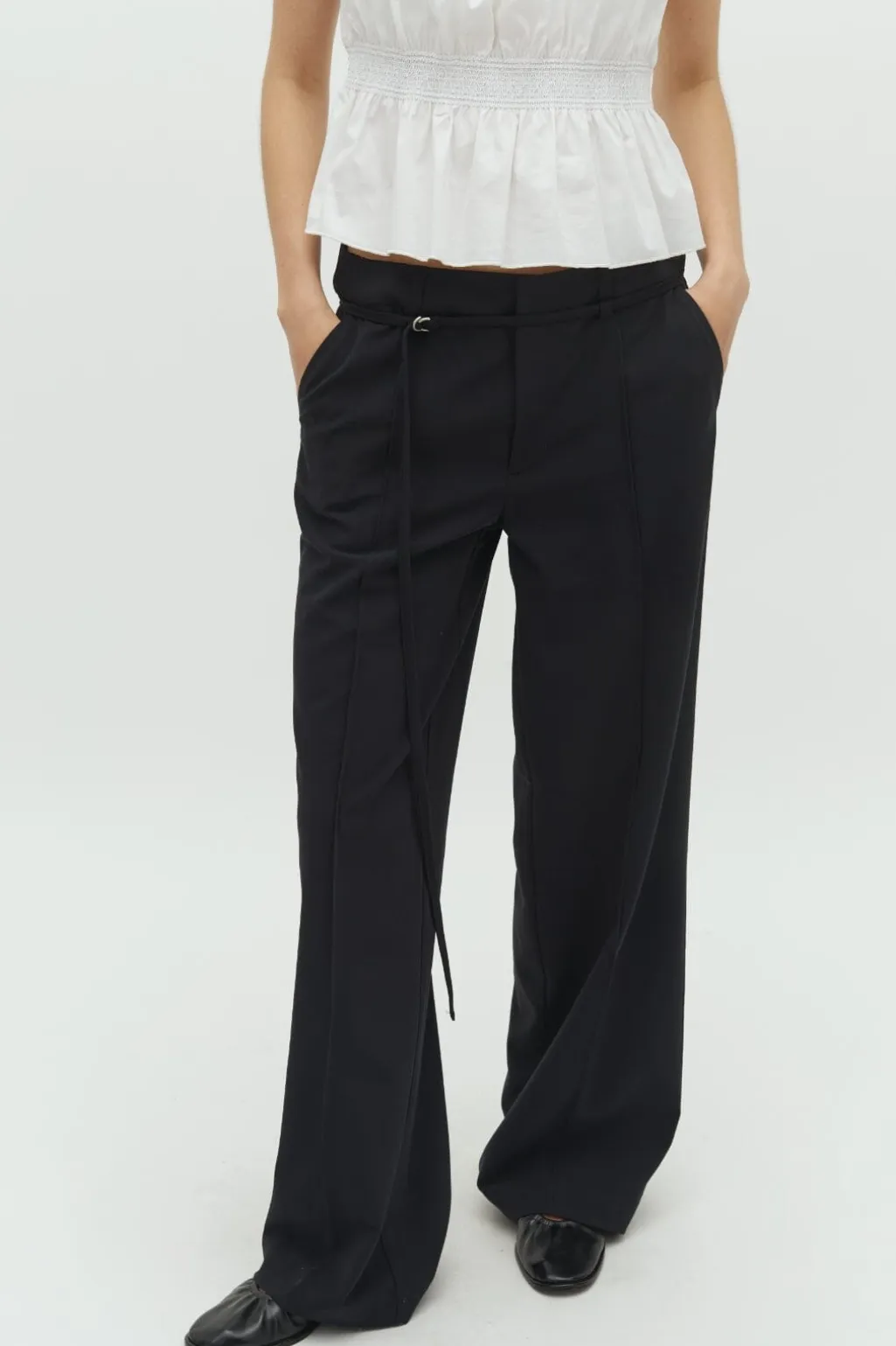 Sorte bukser fra MbyM med gulvlængde og lige ben. Bukserne har dekorative syninger og et bindebånd i taljen, der giver dem et rent og enkelt udtryk.