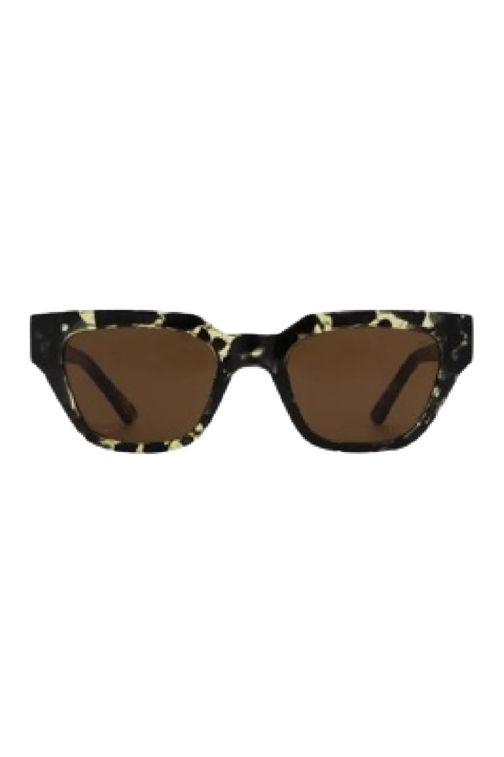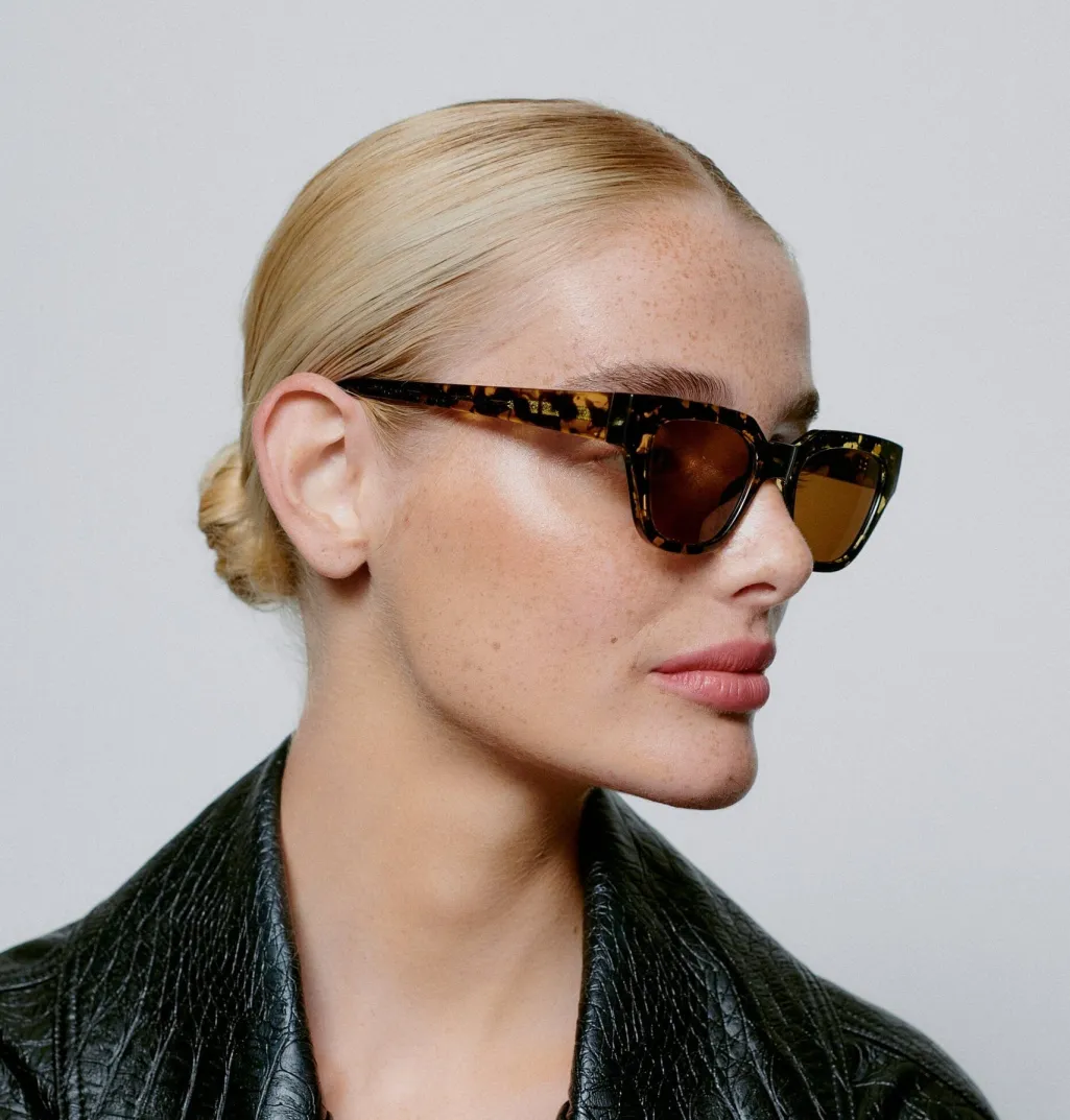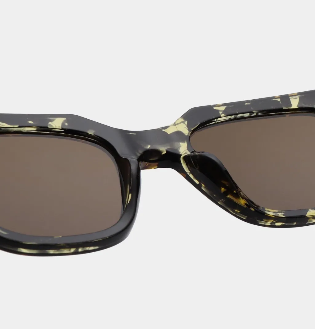 Rektangulære solbriller fra A. Kjærbede i sort og gul skildpaddeskal. Stellet har brune tonede linser og er lavet af polycarbonat med formbare stænger til individuel tilpasning.