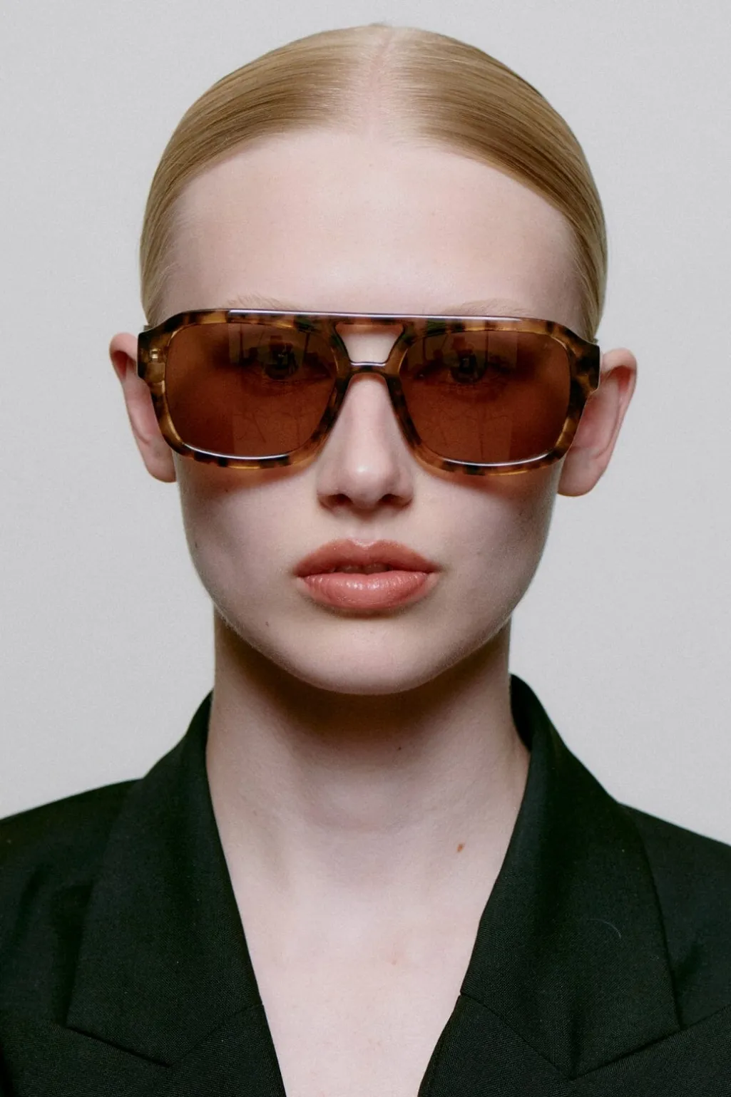 Solbriller fra A. Kjærbede med brun aviator-stel i polycarbonat. Brillen har brune linser med UV 400-beskyttelse og er udstyret med formbare stænger med metalkerne.