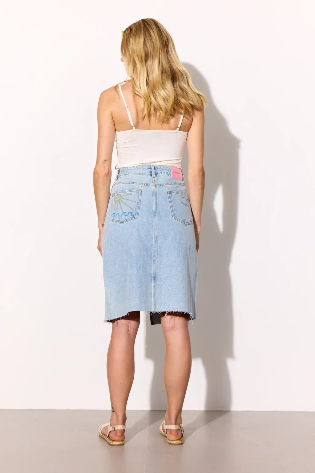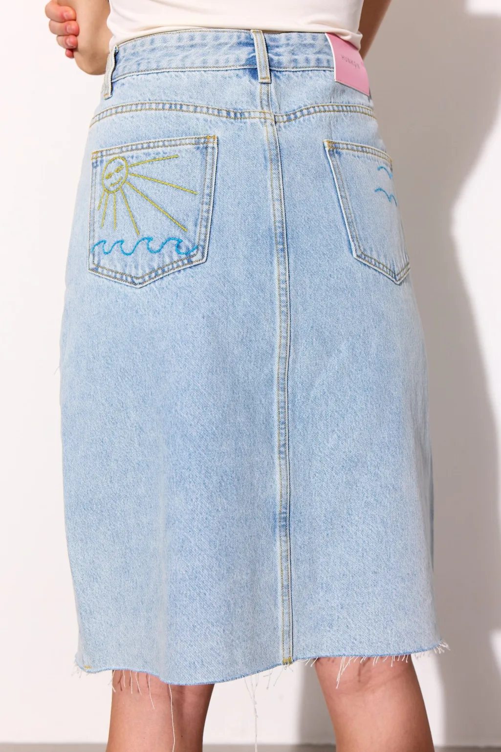 Denimnederdel fra Hunkøn i lys blå denim. Nederdelen har rippede detaljer foran og broderi på baglommerne med sol- og bølgemotiv.