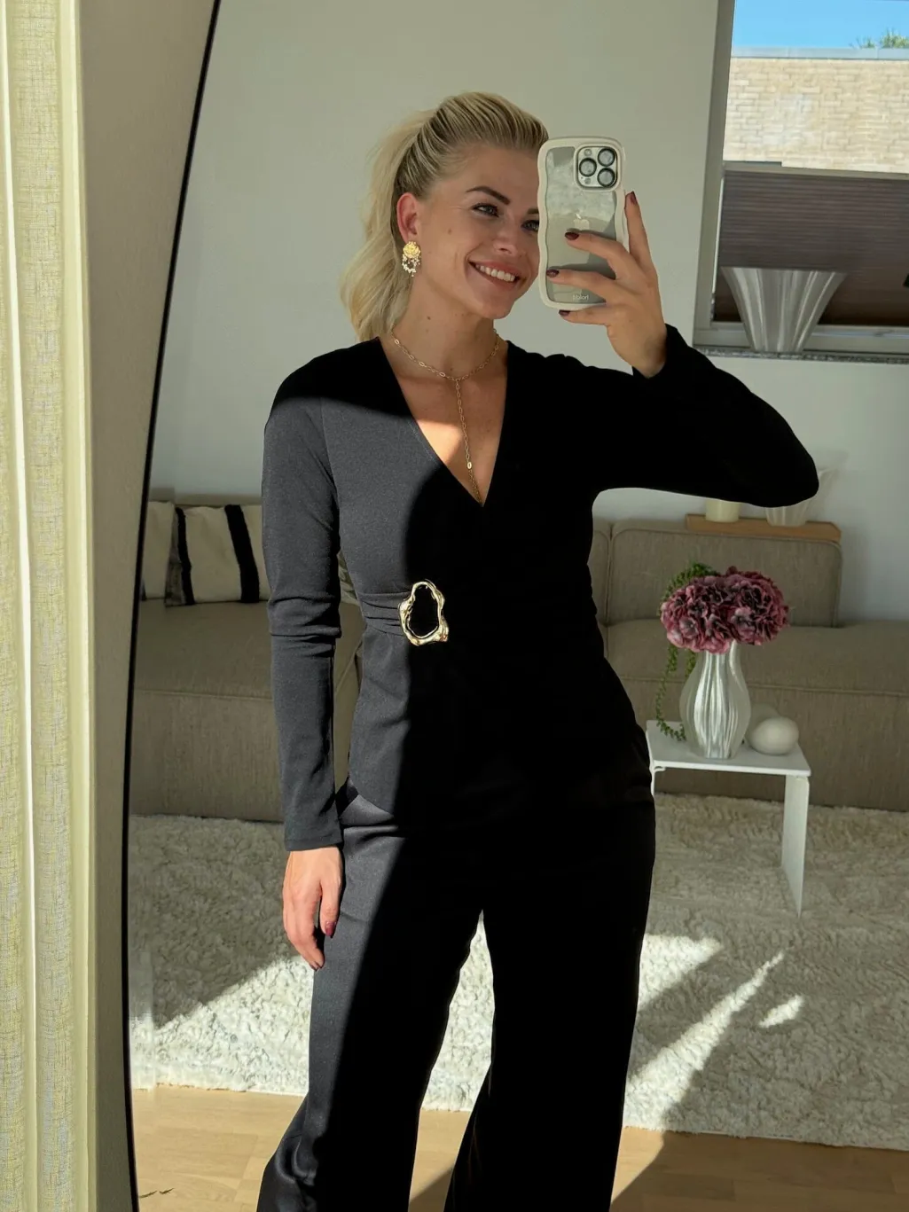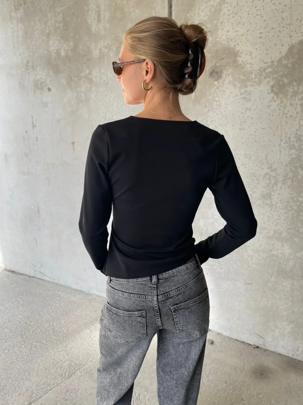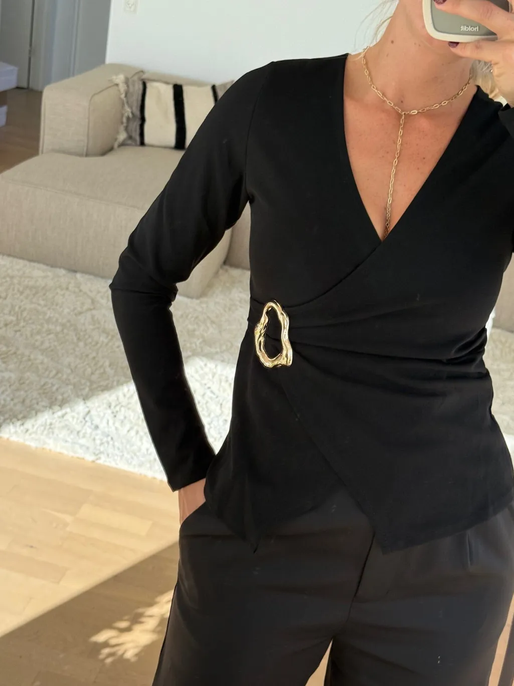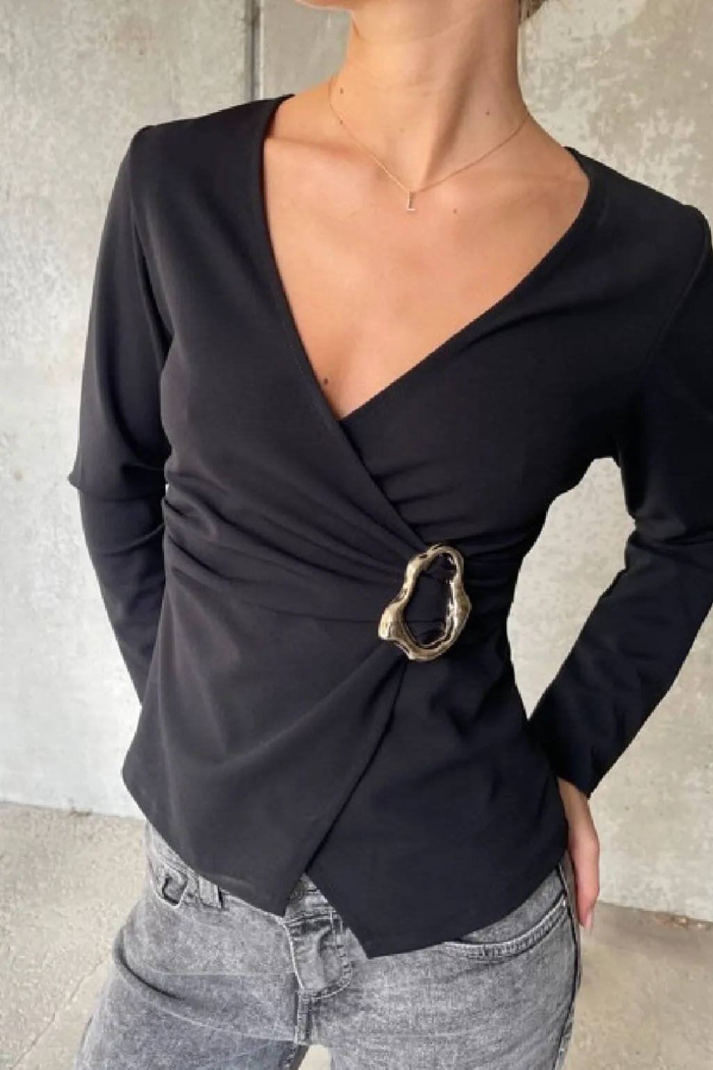 Sort top fra Sisters Point med en dyb V-udskæring og lange ærmer. Toppen har et metallisk spænde ved taljen og en asymmetrisk kant.