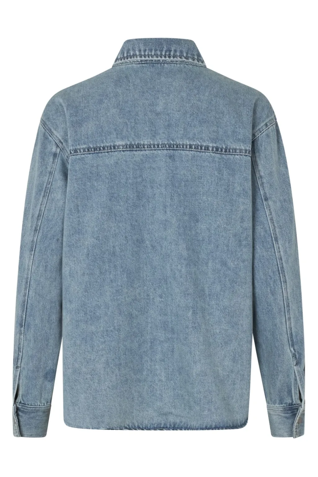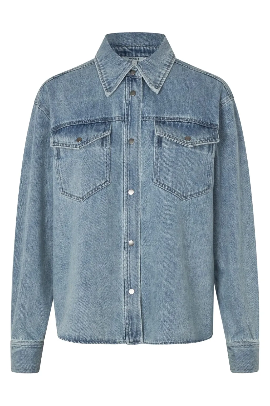 Denimskjorte fra MbyM i lys blå bomuld med en acid wash-effekt. Skjorten har en klassisk skjortekrave og lukkes med trykknapper foran.