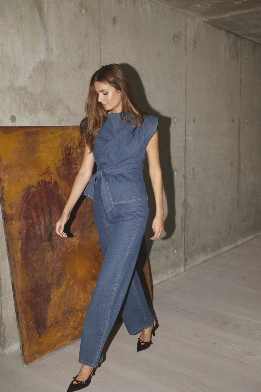 Mørkeblå plisseret top fra Co´Couture i en denimnuance med tynde striber. Toppen har korte ærmer og en høj hals.