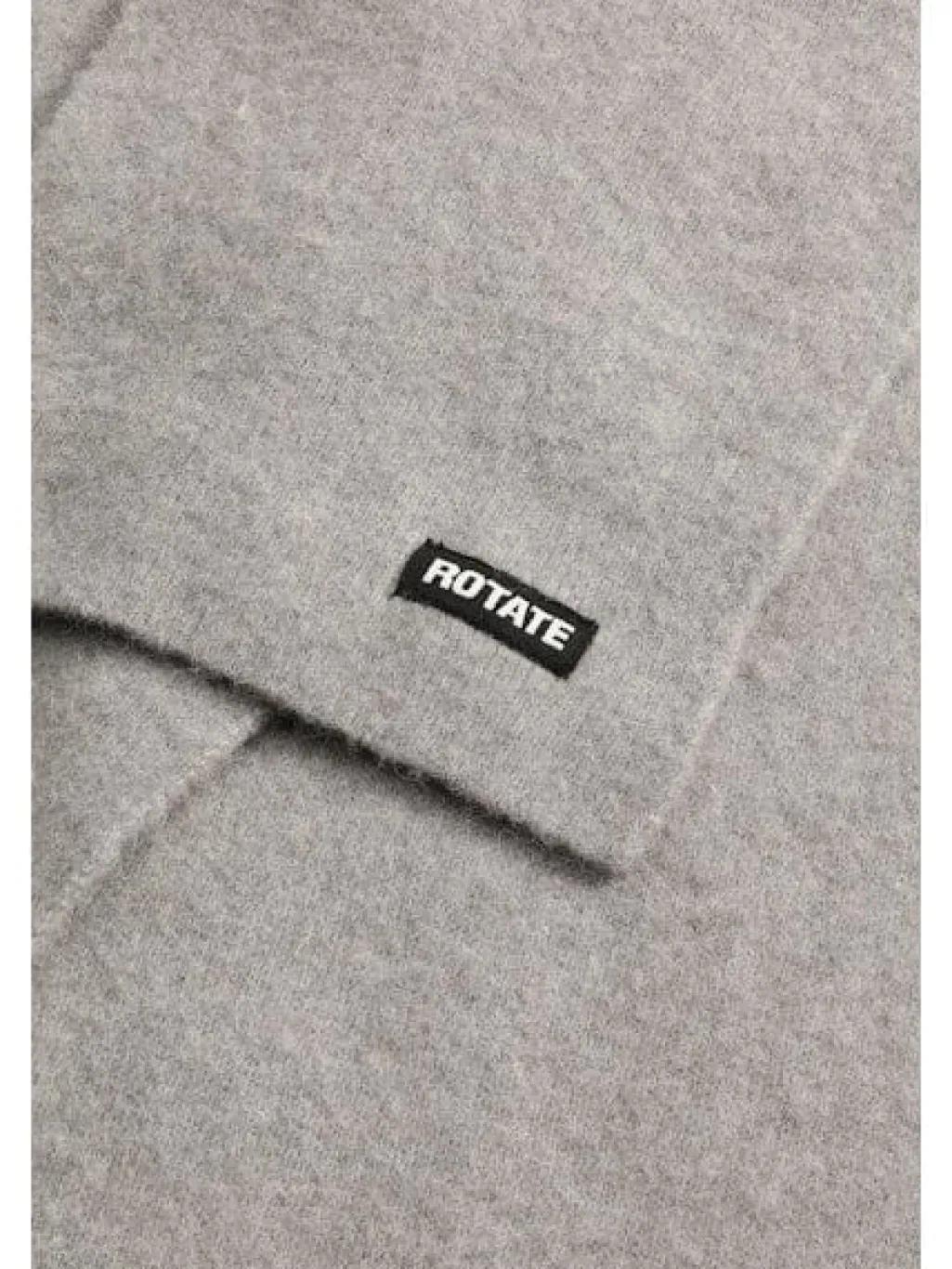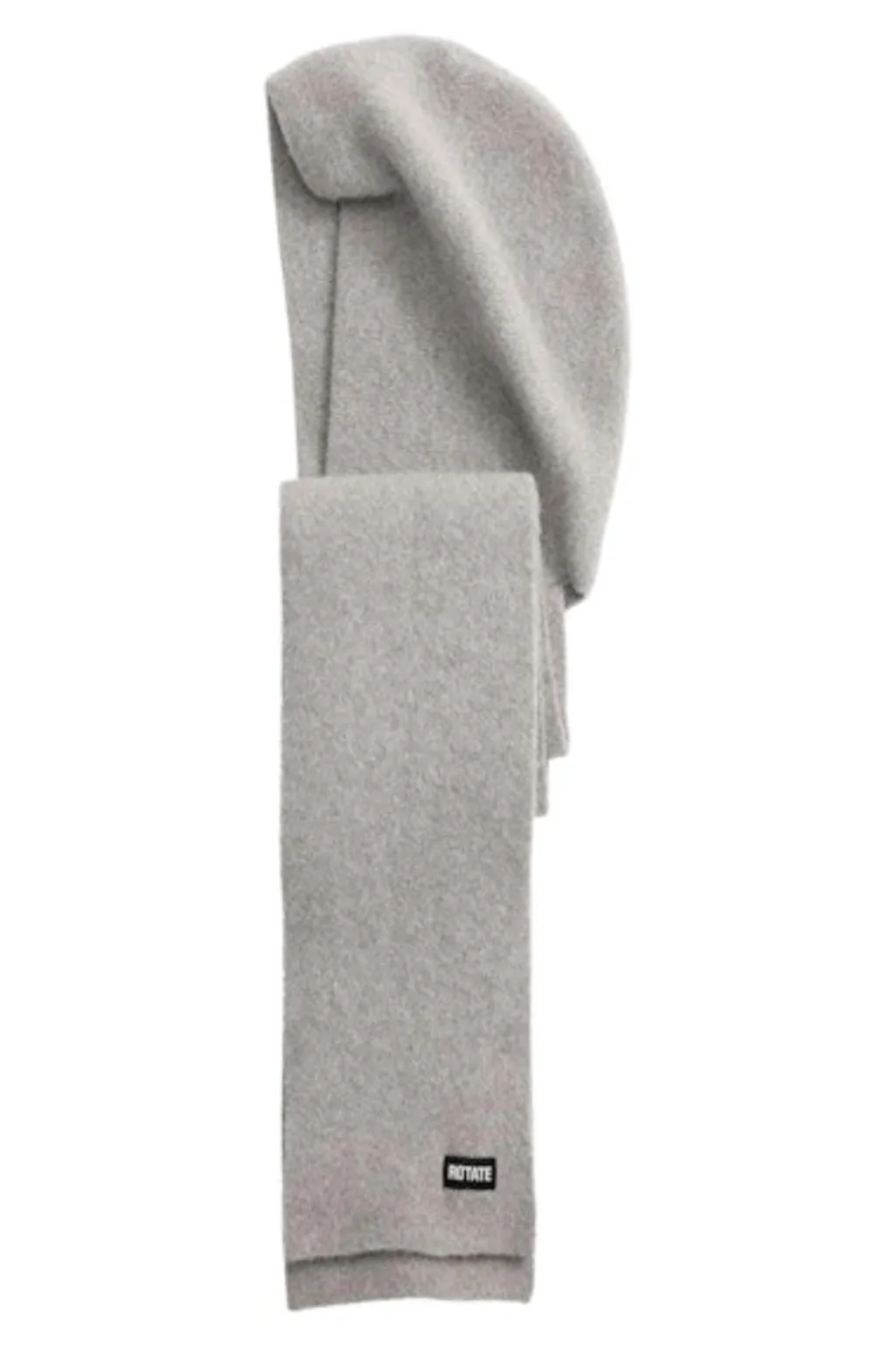 Strikket hætte-tørklæde fra Rotate i en lysegrå nuance. Designet kan bæres både som hætte og tørklæde.