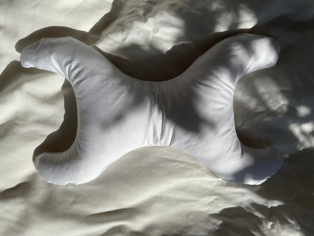 Hvid specialpude fra Save My Face med X-formet design. Puden har et aftageligt betræk i hvid bomuld og en særlig fyldblanding, der modstår fugt og sved.