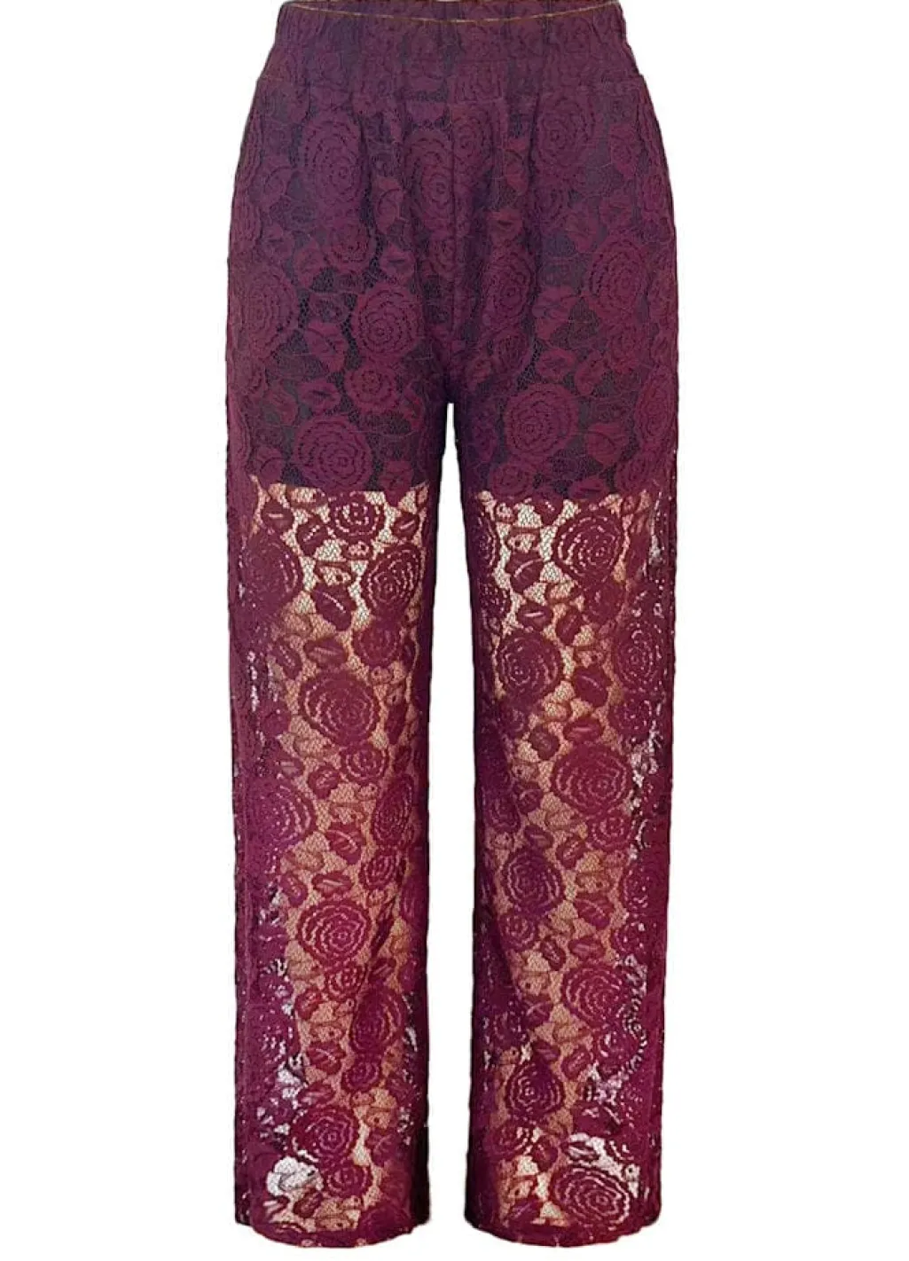 Blondebukser fra Liberte i bordeaux. Bukserne er lavet af gennemsigtig blonde med blomstermønster og passer til formelle begivenheder og festlige lejligheder.