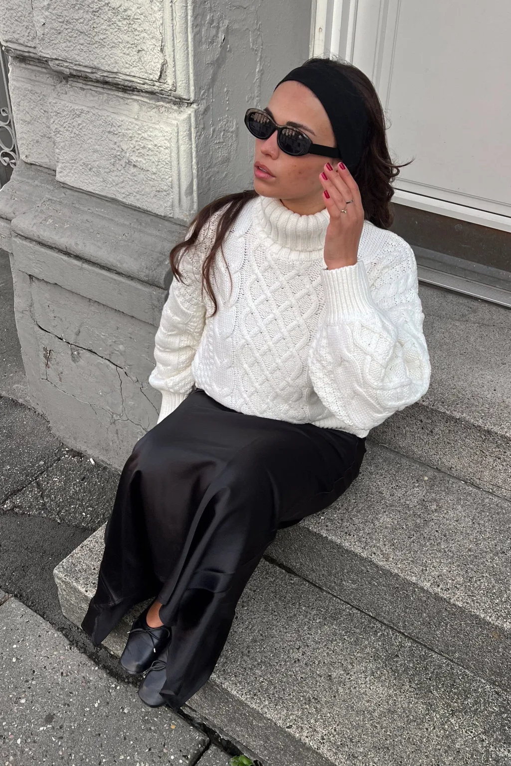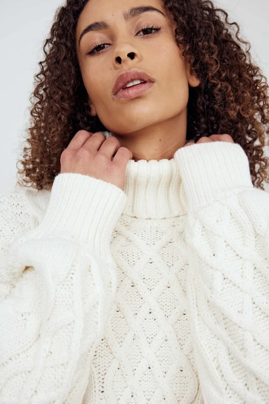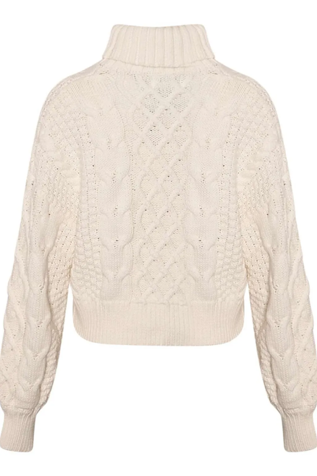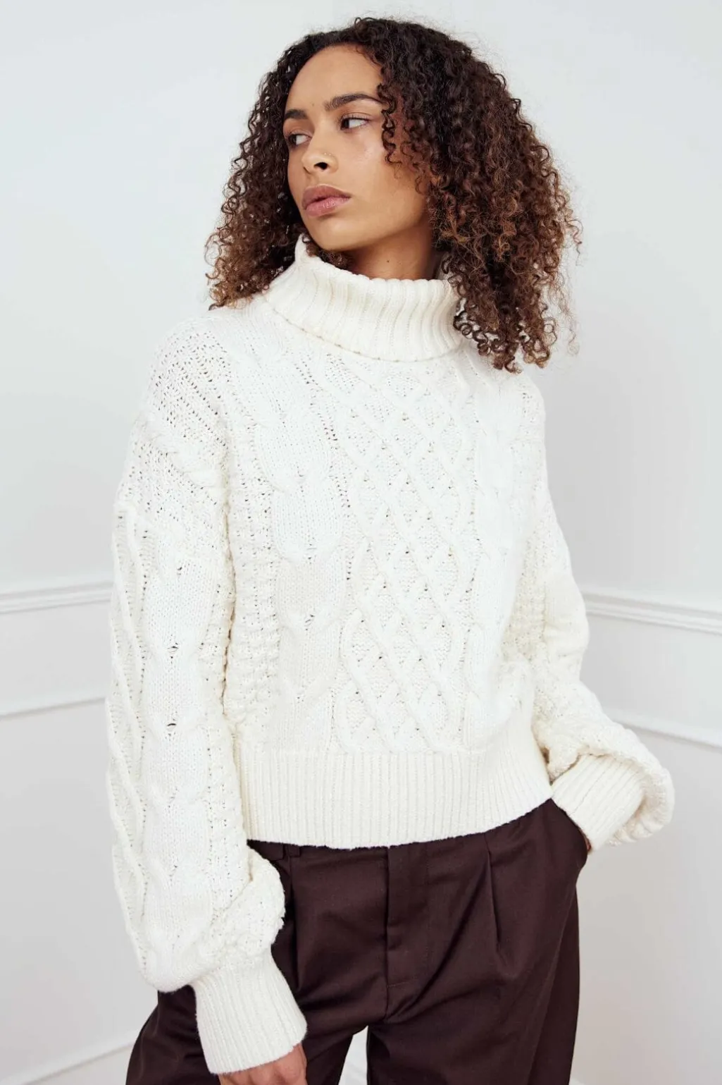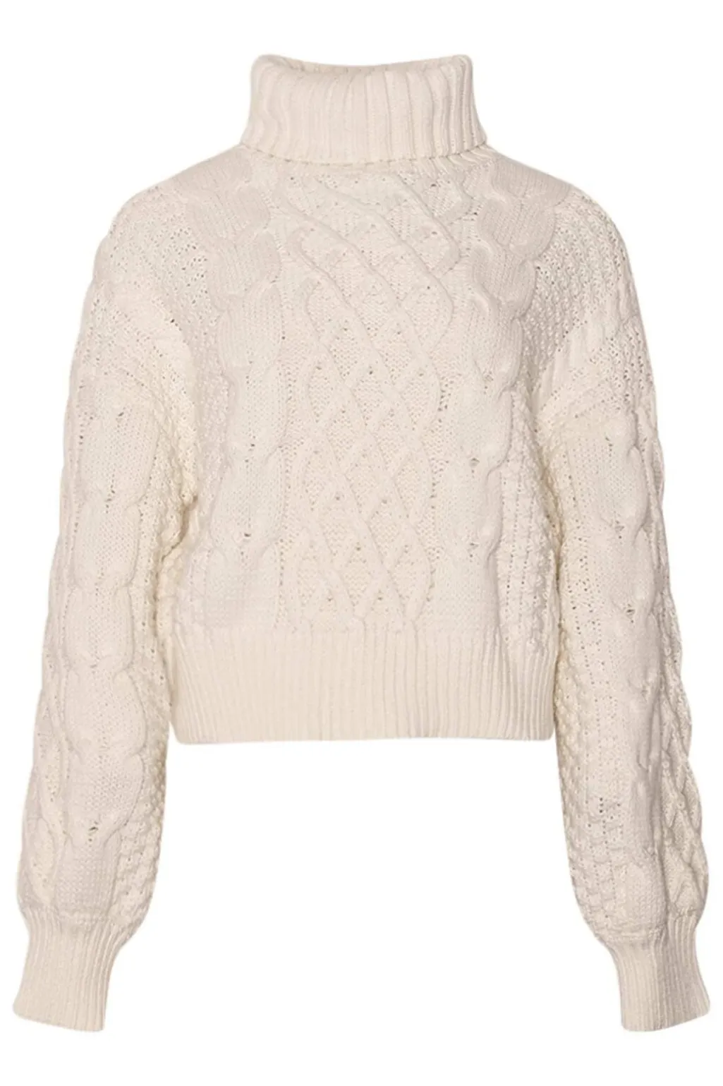En off-white striktrøje fra Noella med kabelstrikdetaljer på forsiden. Trøjen har en høj rullekrave og lange ærmer med flettemønster.