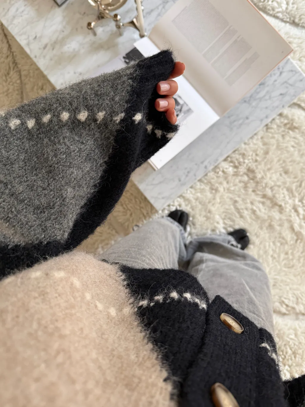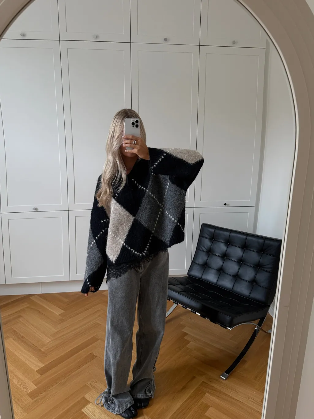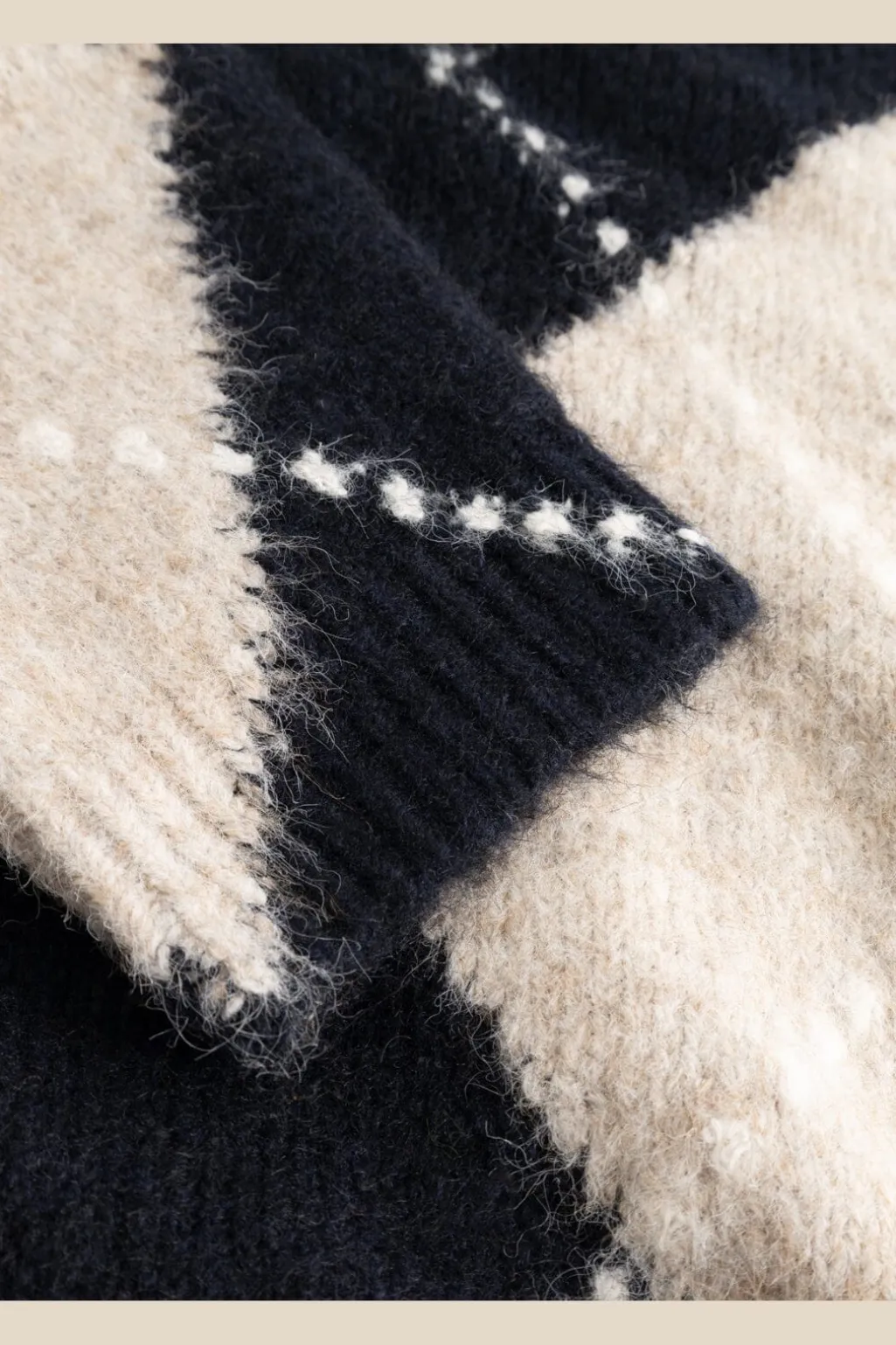 Striktrøje fra Noella med store diamantformede mønstre i mørkeblå, grå og beige. Den har V-hals og lange ærmer med en løs pasform.