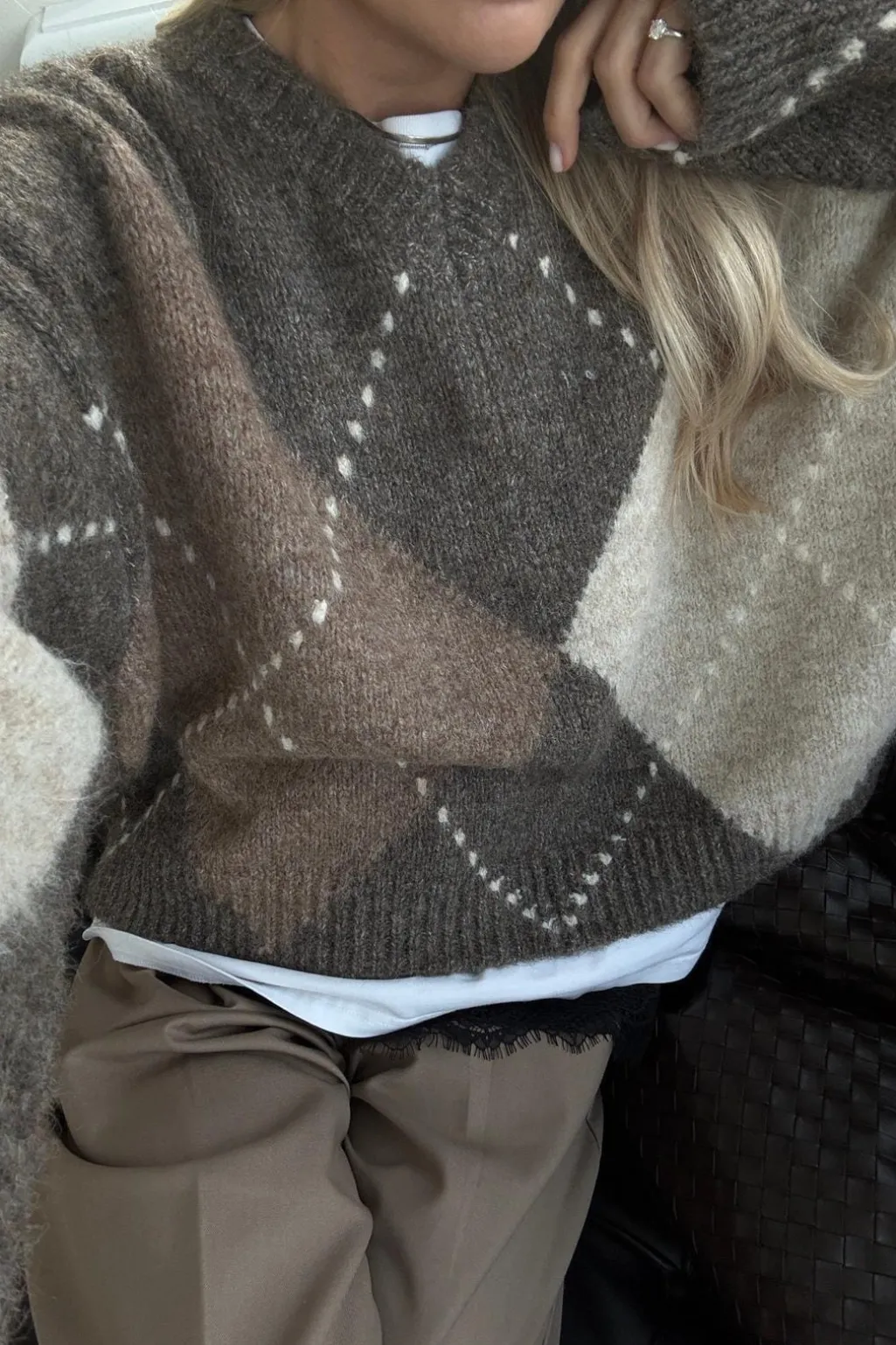 Strik fra Noella i en blanding af brune og lyse beige nuancer. Sweateren har et klassisk argyle-mønster med dekorative syninger.