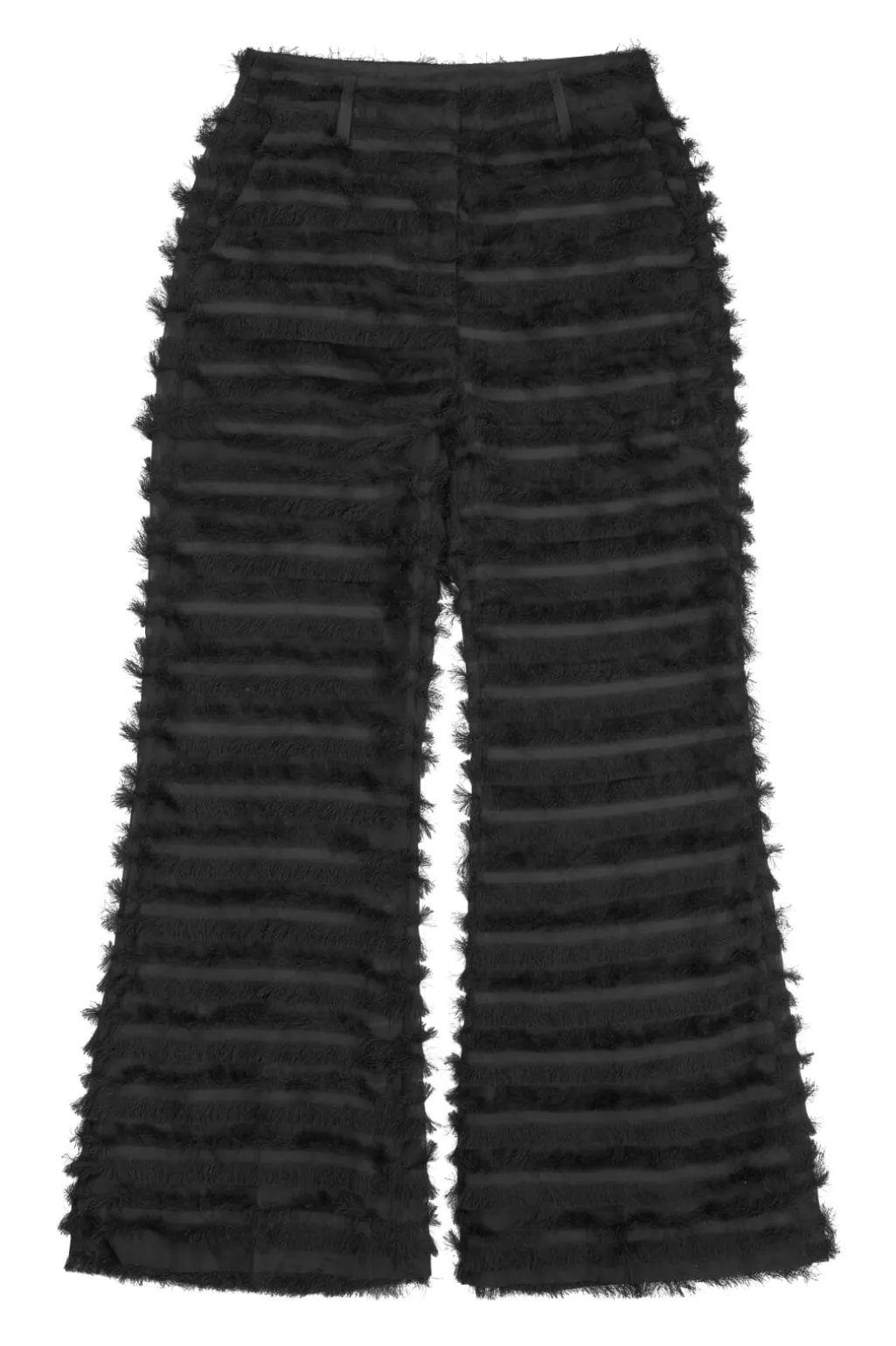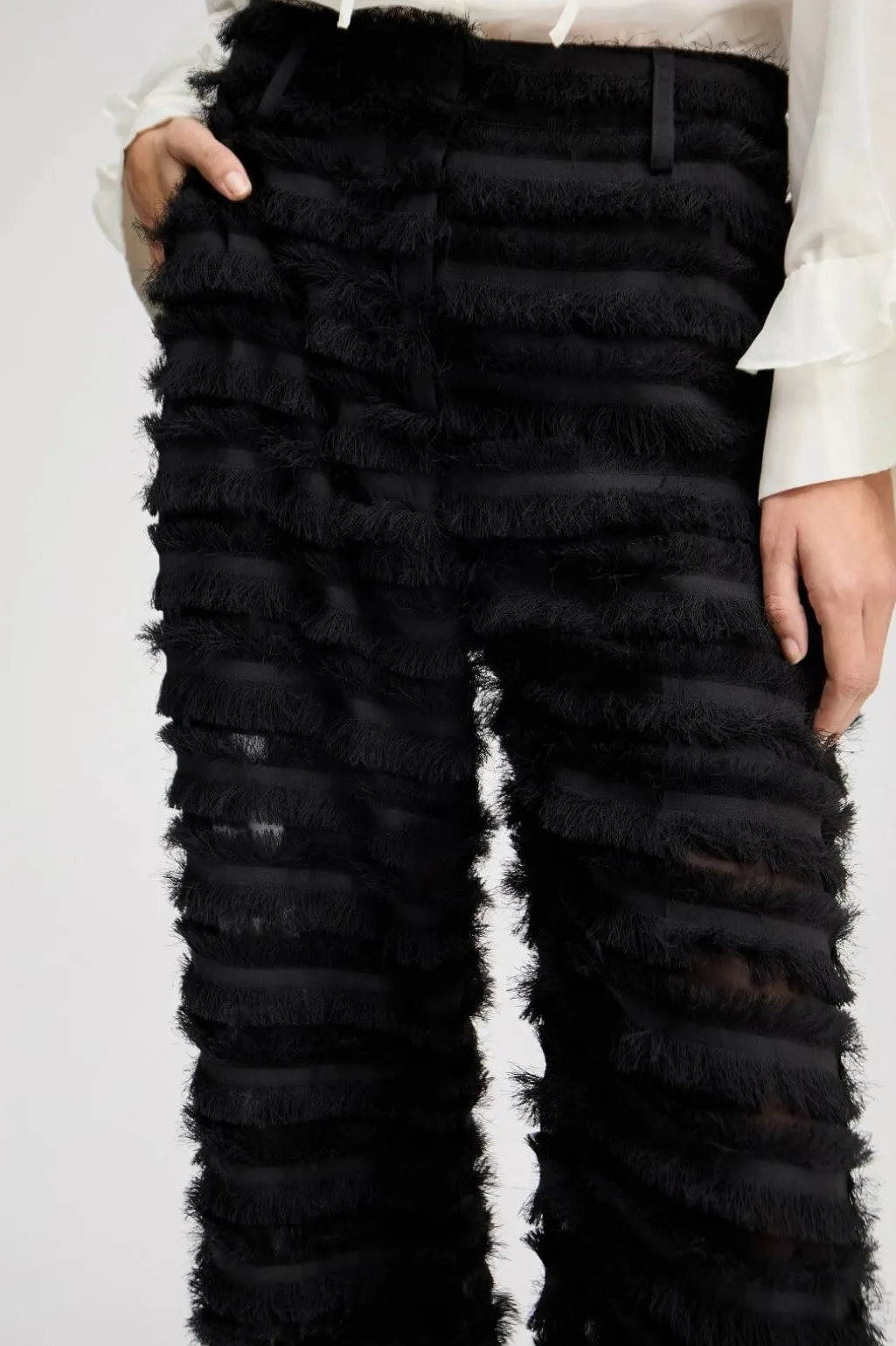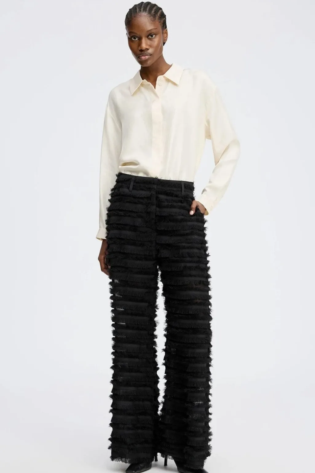 Sorte bukser fra Munthe med vandrette frynser. De brede ben og den løse pasform giver bukserne et let, transparent udtryk. Bukserne har lommer og bæltestropper ved taljen.