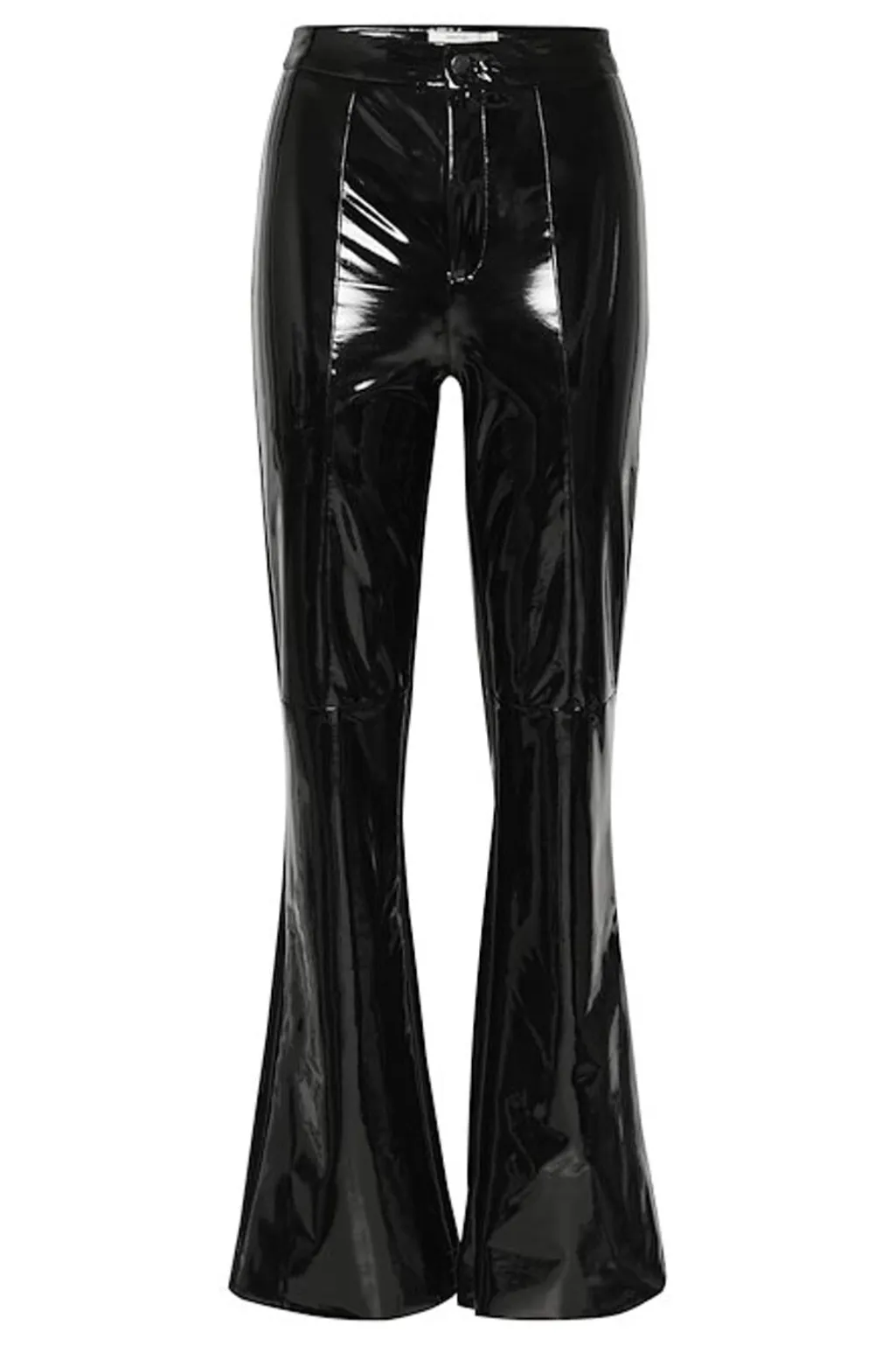 Sorte bukser fra Gestuz med en skinnende overflade. Bukserne har et flared design og en gulvlang længde, som giver en flot silhuet.