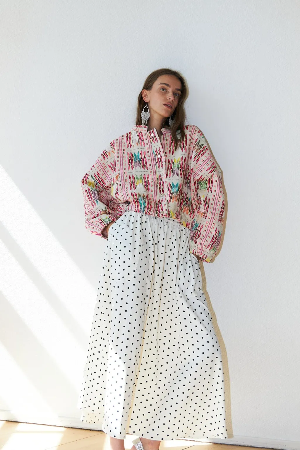 Pink jakke fra Lollys Laundry med et farverigt, geometrisk mønster i pink, orange, grøn og lilla.