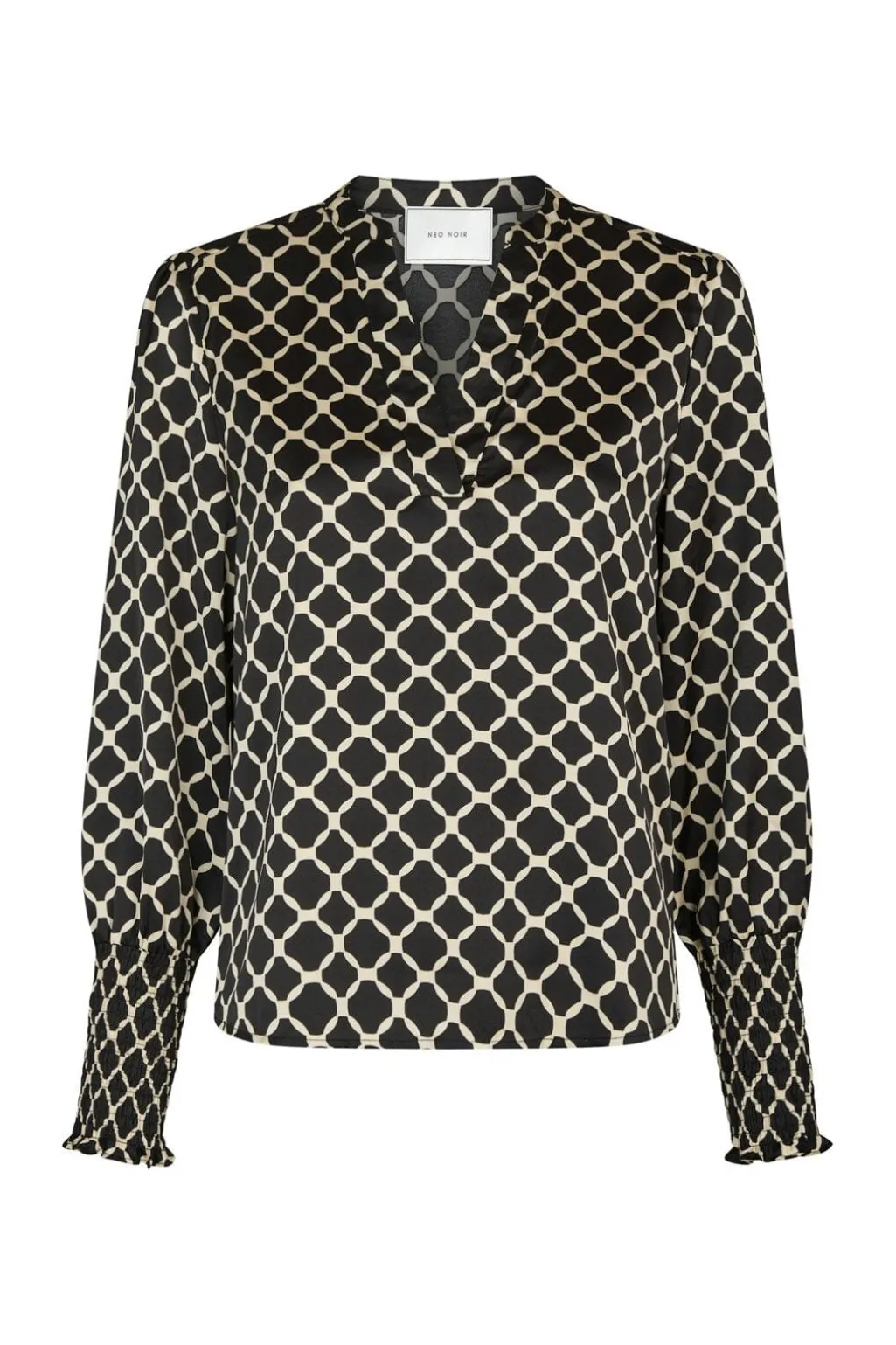 Bluse fra Neo Noir med sort og cremefarvet flisemønster. Den har en løs pasform med V-hals og lange ærmer med smockede manchetter ved håndleddene.