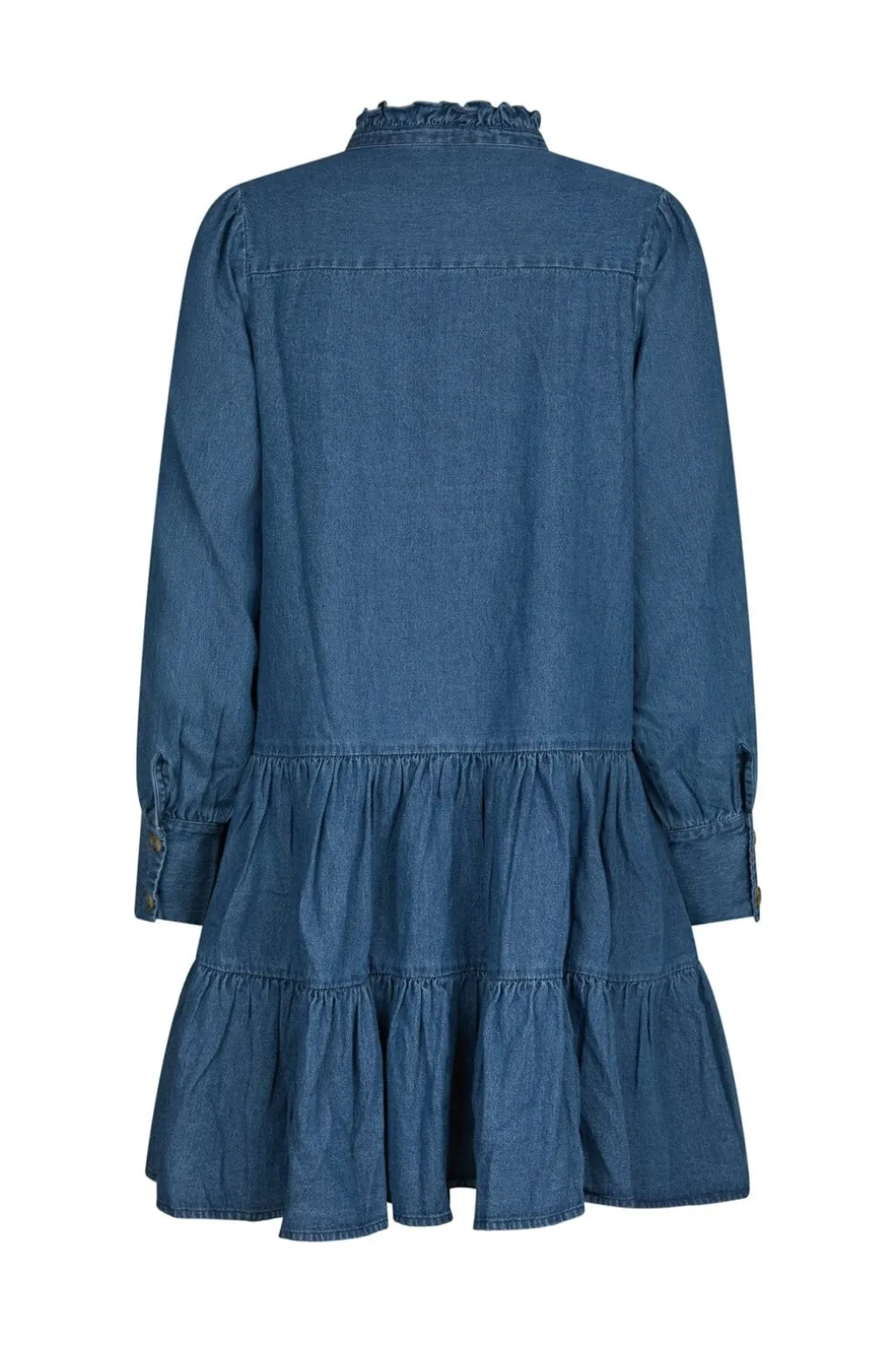 Blå denimkjole fra Neo Noir, lavet af 100 % bomuld. Kjolen har en høj hals med flæser, lange ærmer og et lagdelt skørt.