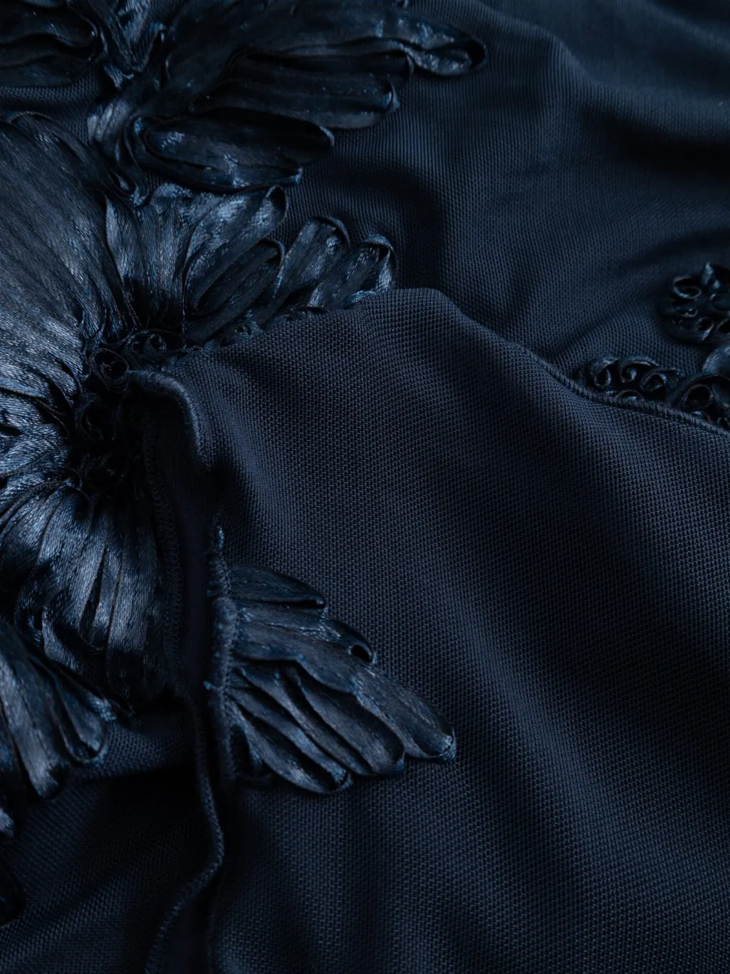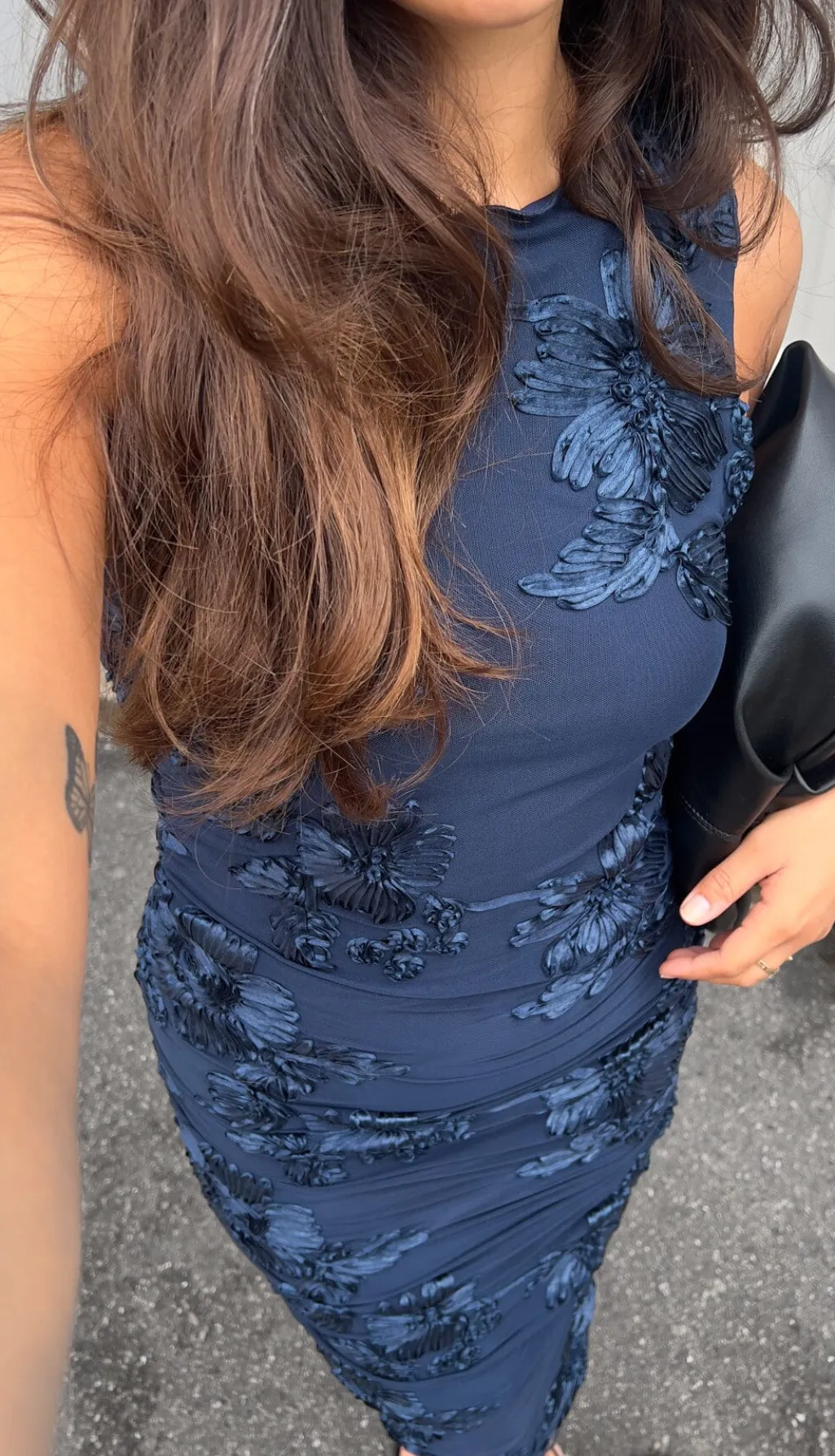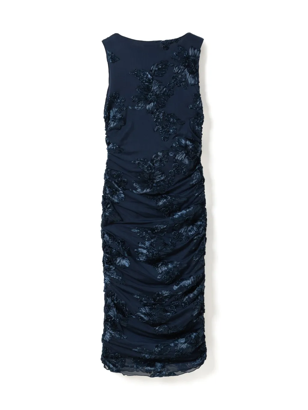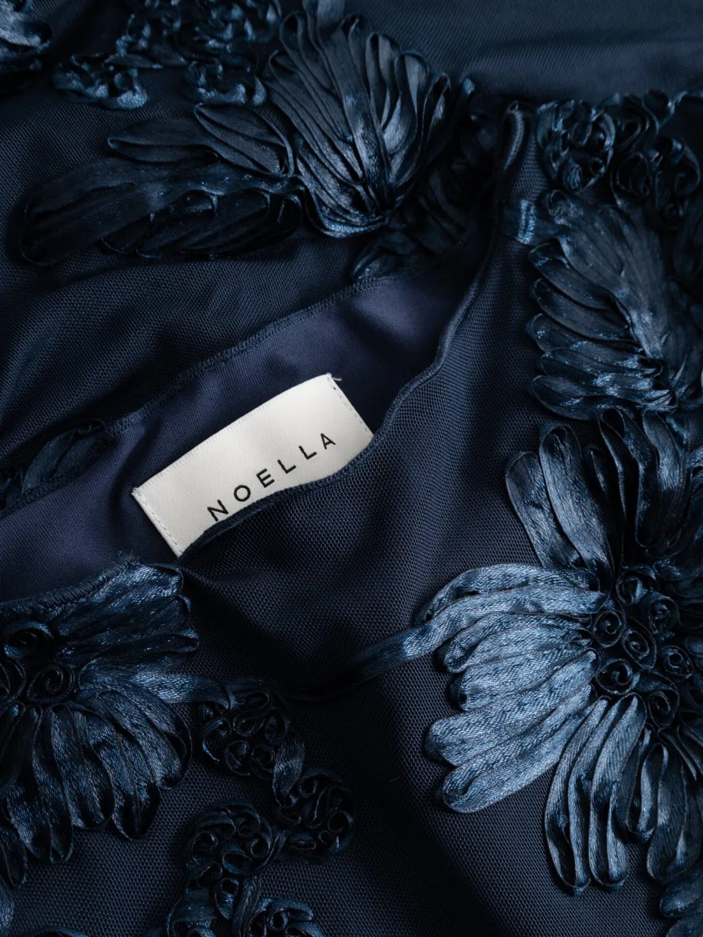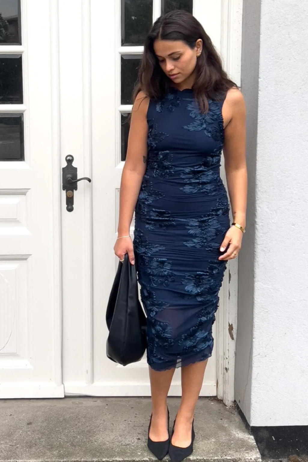 Mørkeblå kjole fra Noella med broderede blomster og rynkede detaljer langs siderne. Kjolen går til læggene og har en høj halsudskæring uden ærmer.