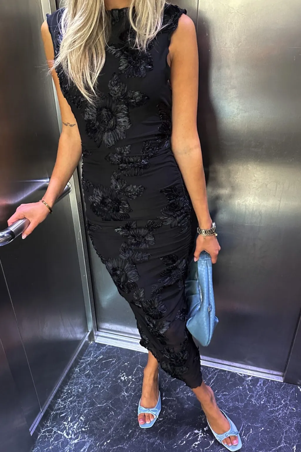 Sort kjole fra Noella med broderede blomster. Kjolen har en tætsiddende pasform og går til midt på læggen. Den runde halsudskæring og det ærmeløse design giver et rent udtryk.