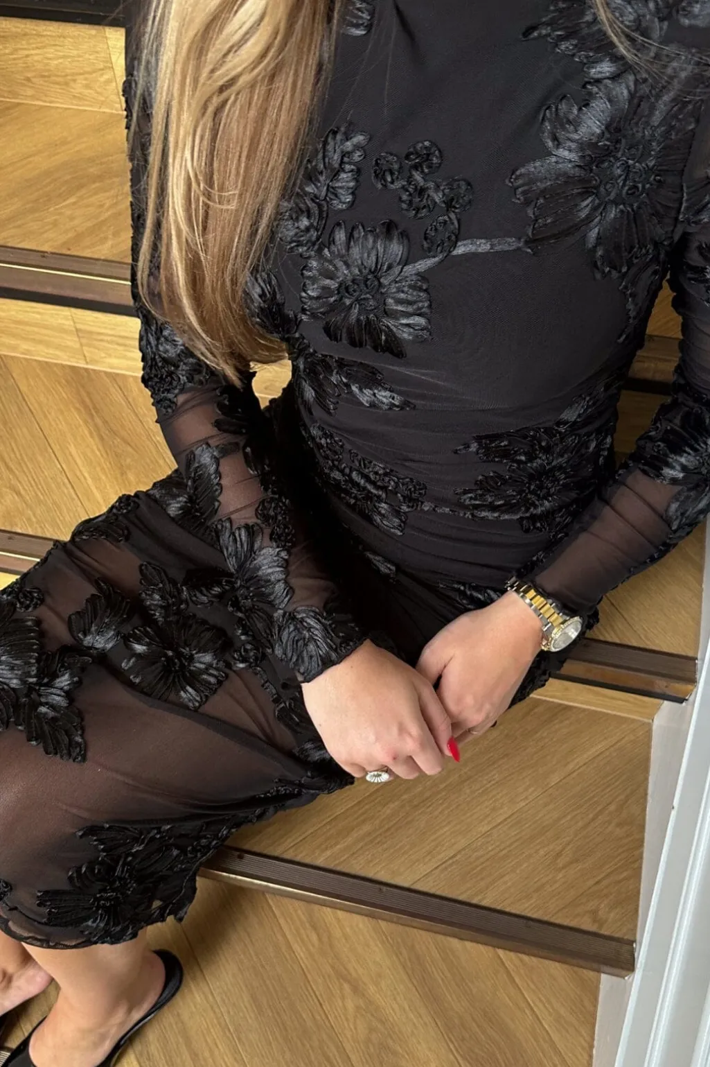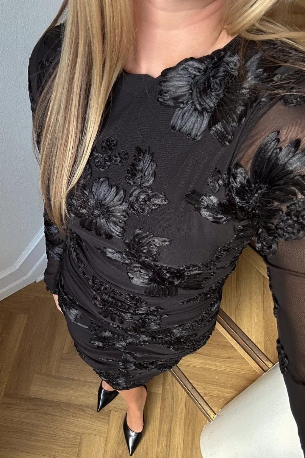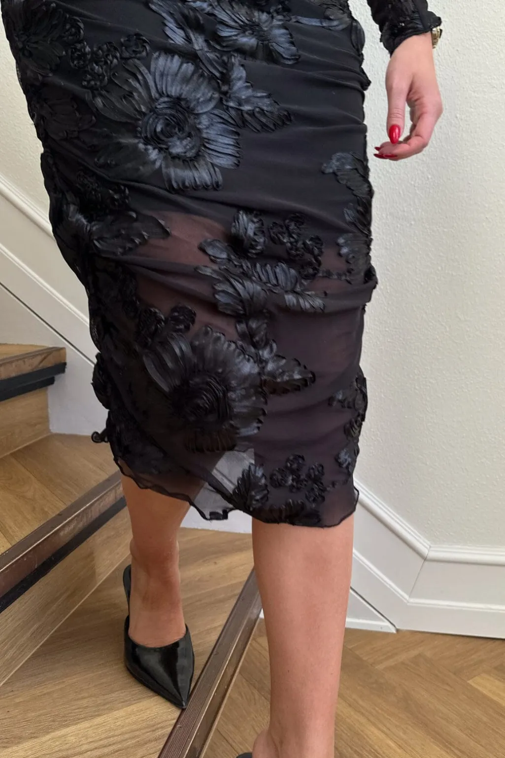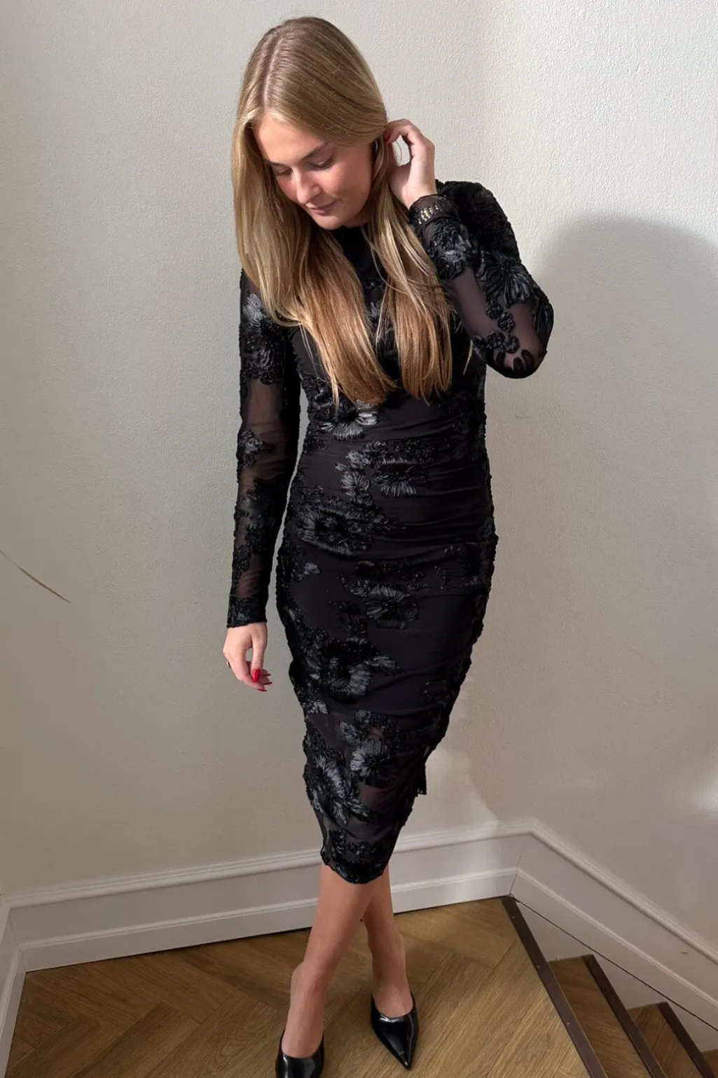 Sort kjole fra Noella med høj hals og broderede blomster. Kjolen har transparente ærmer og et draperet design med flæsedetaljer fra top til bund.