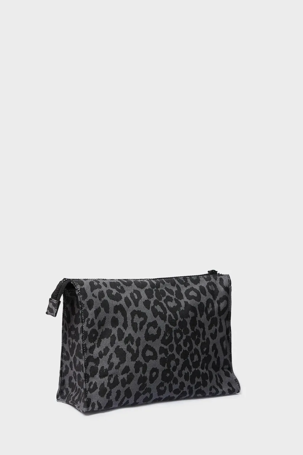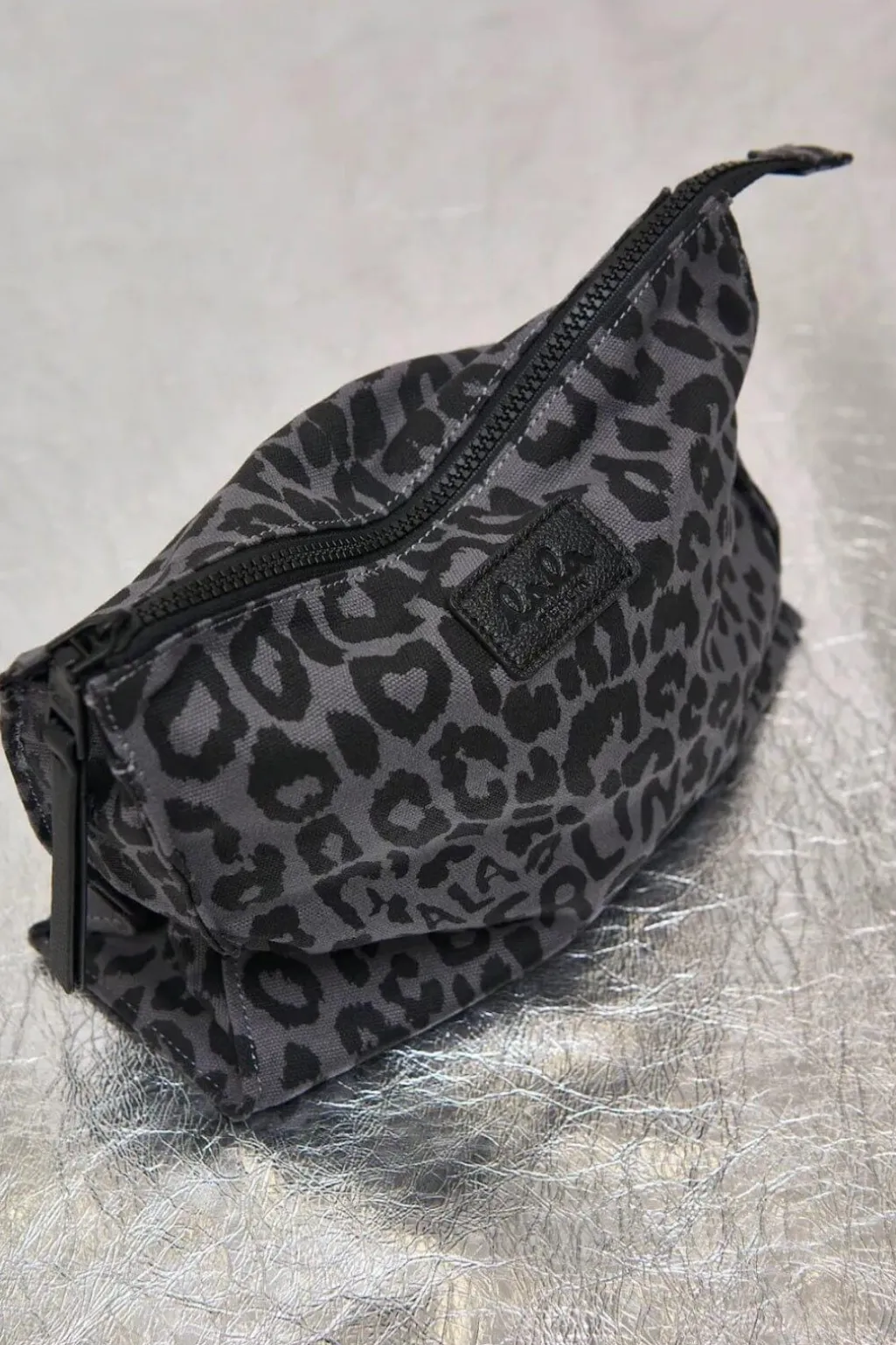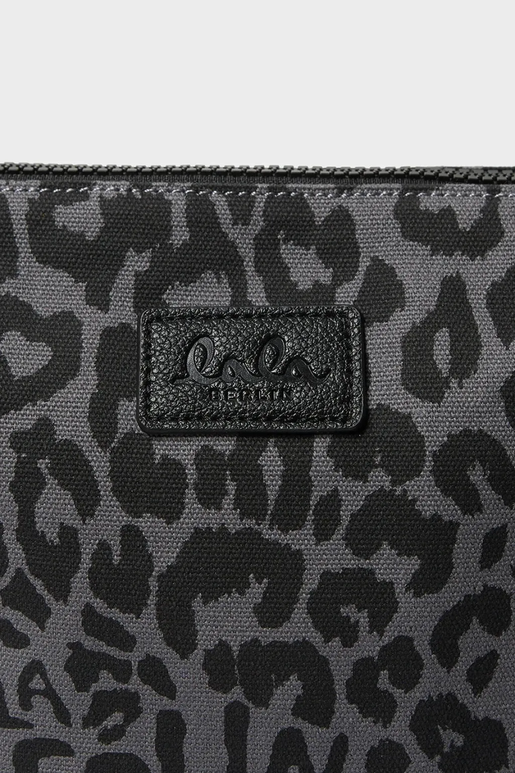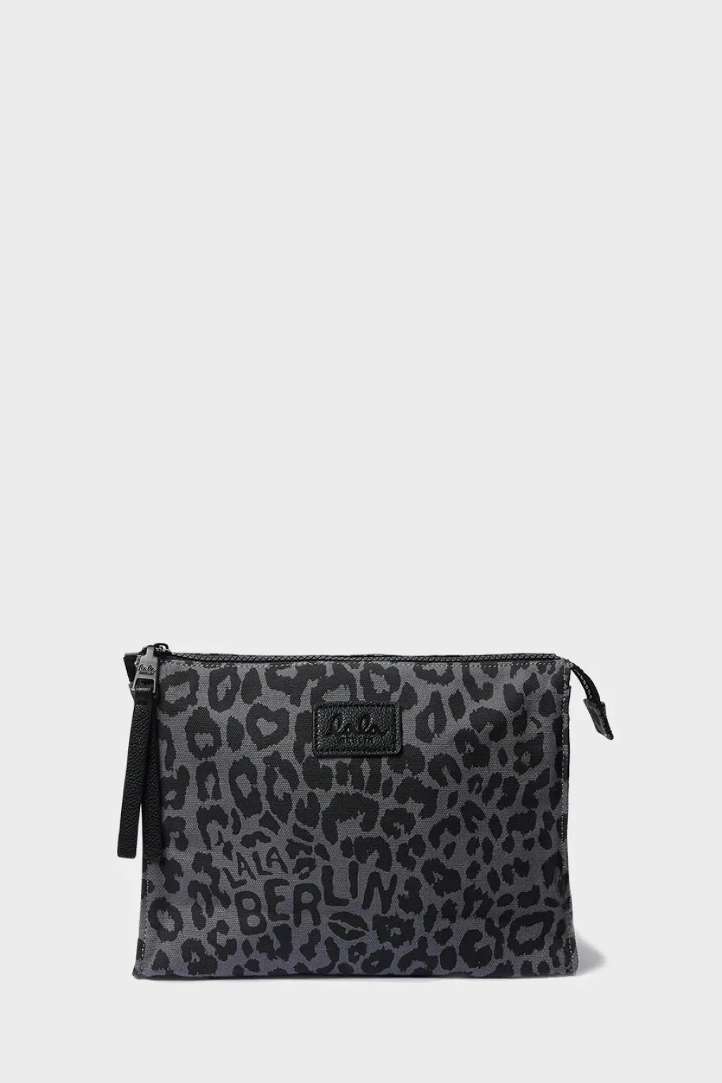 Pung fra Lala Berlin i canvas med leopardmønster i grå og sorte nuancer. Pungen har en synlig lynlås og et Lala Berlin-logo på forsiden.
