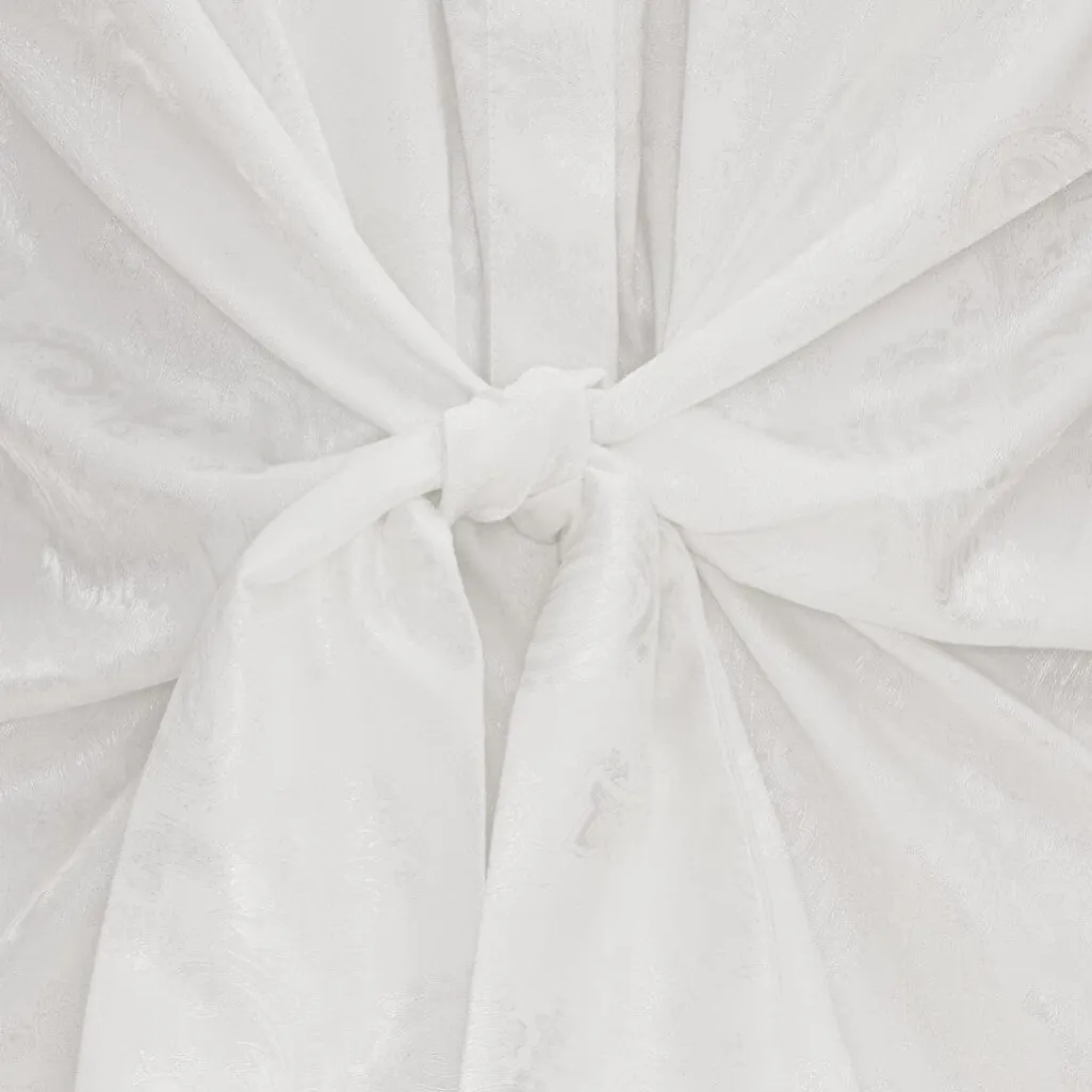 Hvid skjorte med paisley jacquard-mønster fra Karmamia. Den har en klassisk skjortekrave og knapper foran. En knudedetalje i taljen skaber en flot silhuet.