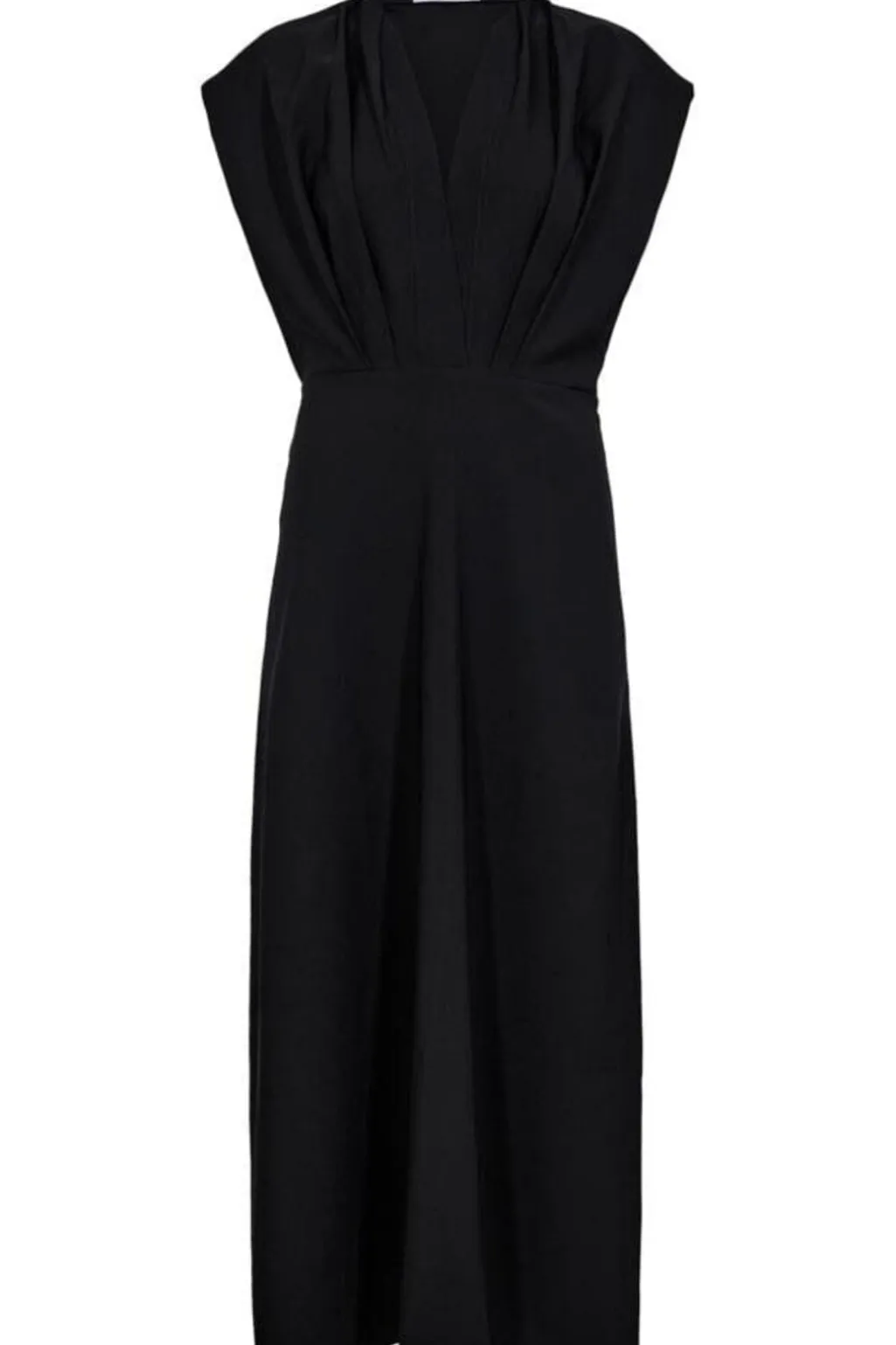 Sort kjole fra Haute L’Amitié med draperet design og V-udskæring. Kjolen har korte ærmer og rækker til midt på læggen.