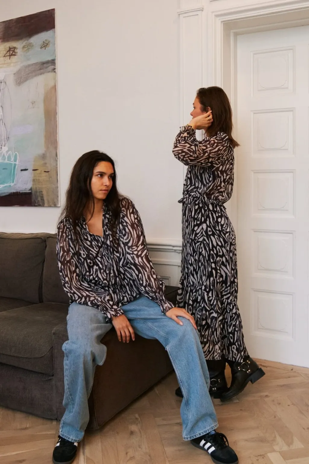 Sort bluse fra Neo Noir med abstrakt leopardmønster i sort og hvid. Blusen har en v-halsudskæring og rynkedetaljer ved kraven.