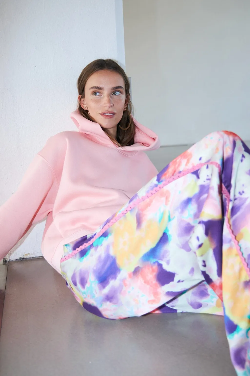 Bukser fra Lollys Laundry i et abstrakt print med nuancer af lilla, pink, blå og gul. Bukserne har en løs pasform med blondedetaljer langs siderne og bindebånd i taljen.