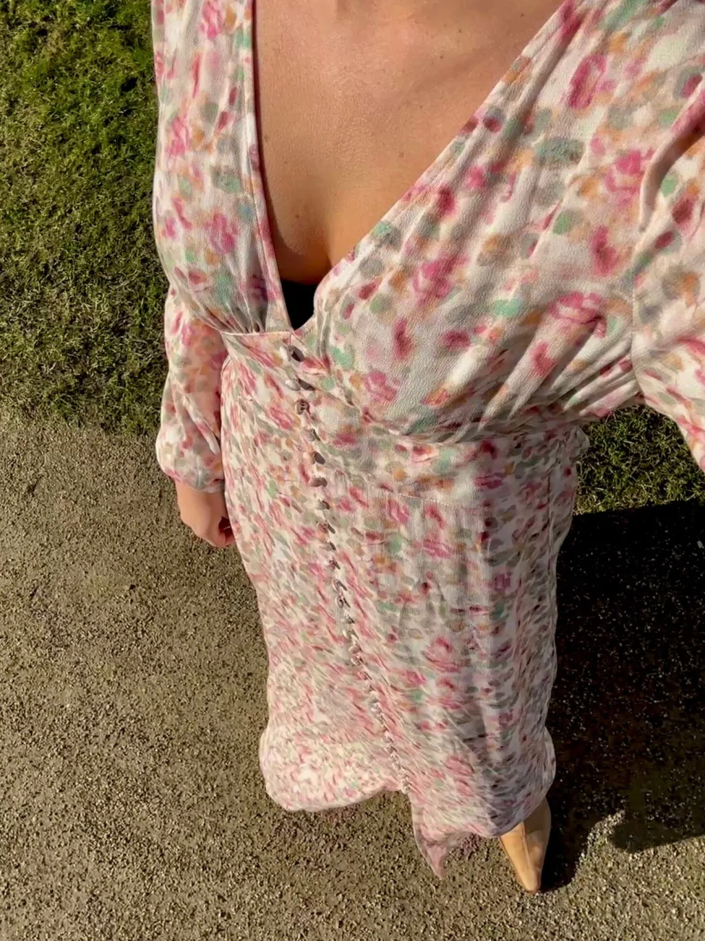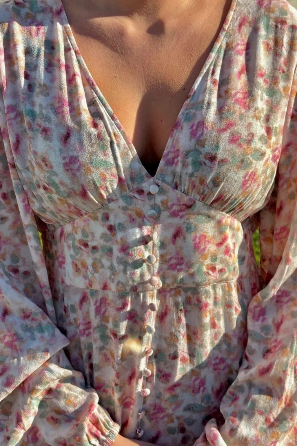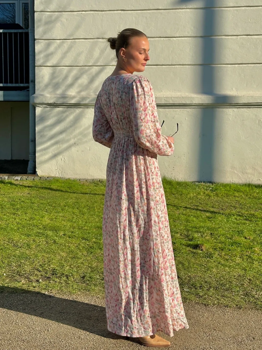Maxikjole i lyserødt blomsterprint fra Noella. Kjolen har knapper hele vejen ned foran, V-udskæring og lange ærmer med volumen. Den løse pasform og det lette stof giver en afslappet silhuet.