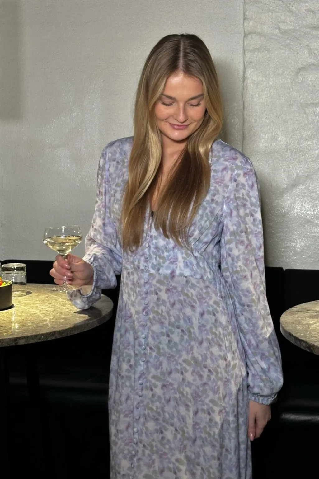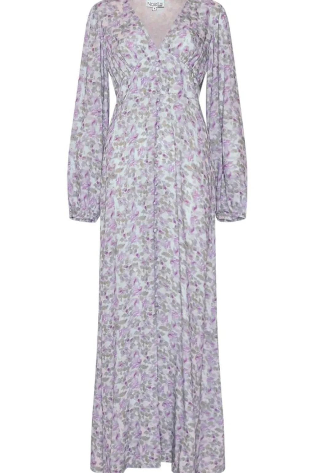 Maxikjole fra Noella i blå og lilla blomsterprint. V-udskæringen og den løse pasform giver god bevægelsesfrihed. De lange ærmer har manchetter, og kjolen lukkes med knapper foran.