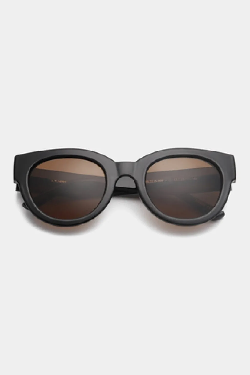 Sorte solbriller fra A. Kjærbede med overdimensioneret cat-eye-form og brune linser. Stellet er lavet af Tritan Renew med en markant bro mellem linserne.