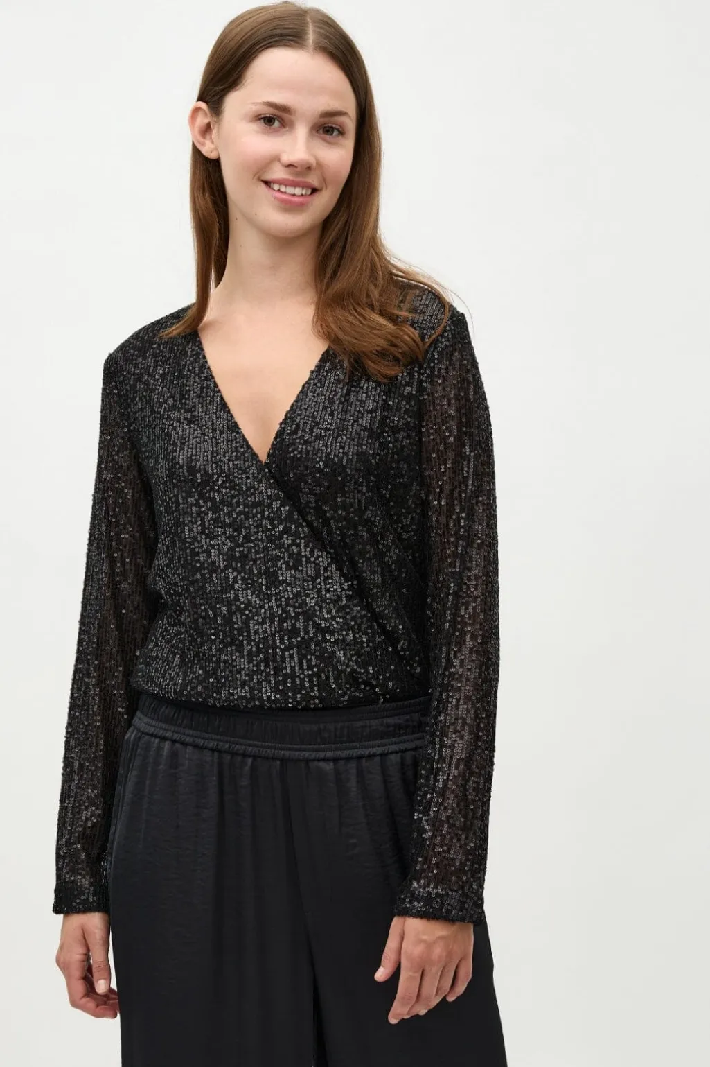 Sort festbluse fra MbyM med palietter over det hele. Blusen har en V-halsudskæring og lange ærmer, der giver den et festligt udtryk til særlige anledninger.