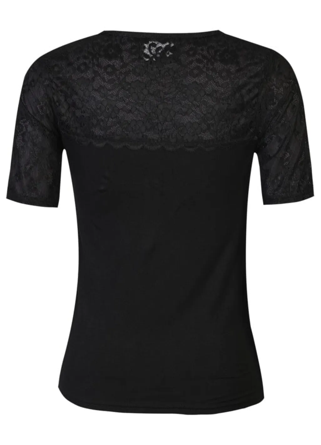 Sort bluse fra Liberte med blonde-detaljer på ærmerne og øverste del. Blusen kan bruges til både formelle begivenheder, hverdagen og festlige lejligheder.