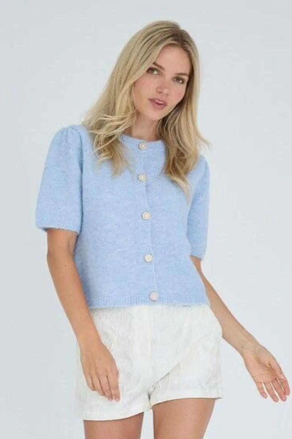 Strikket cardigan fra A-View i lyseblå. Cardiganen har korte ærmer og en knaplukning med perledetaljer.