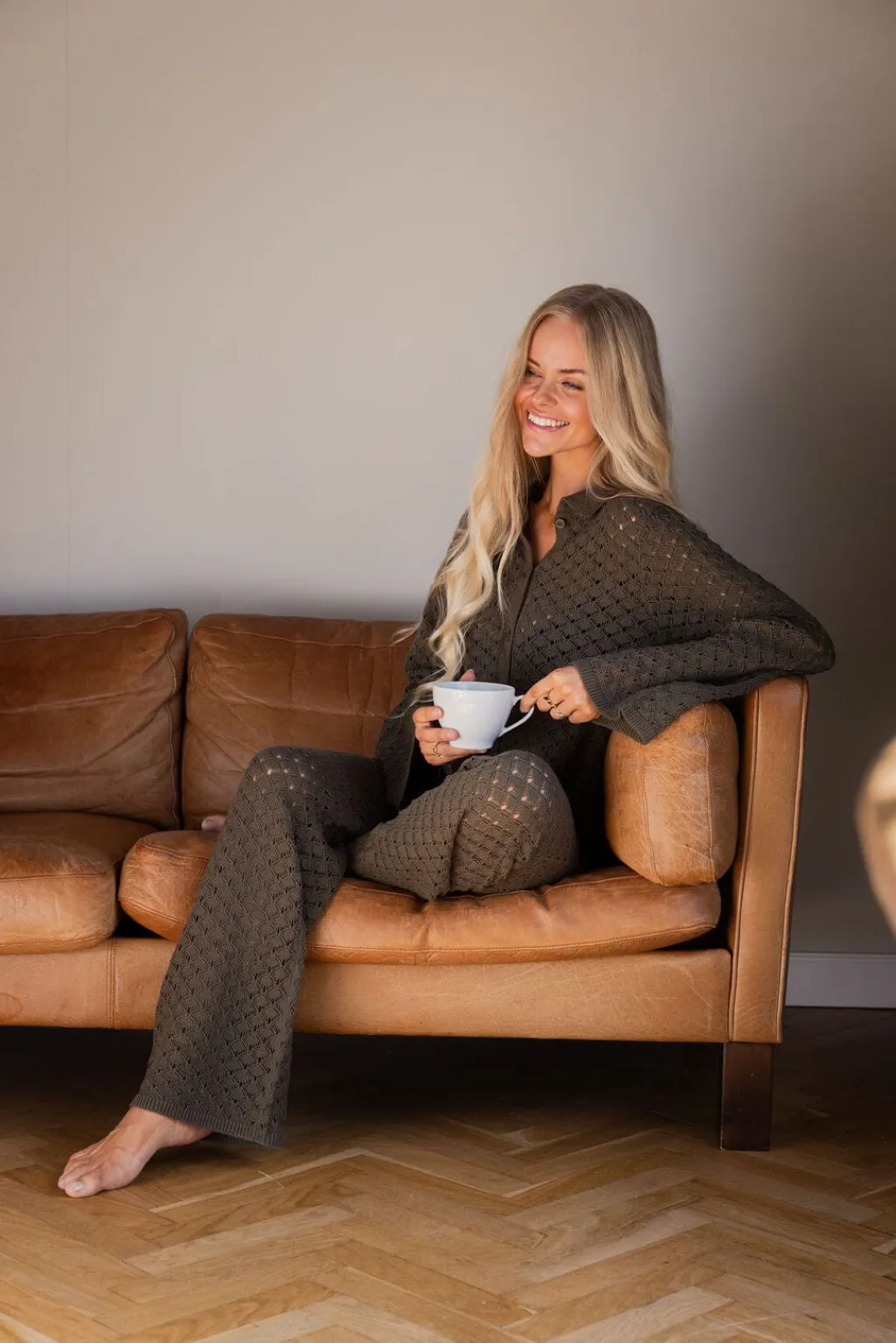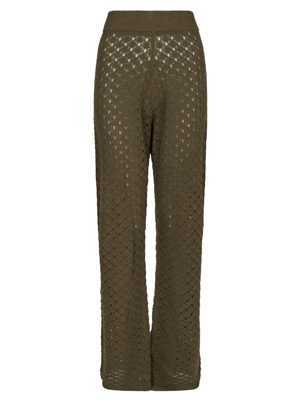 Strikbukser fra Molly&My x Julie Elgaard i grøn khaki-farve. Materialet er 60 % polyester og 40 % viskose med et synligt hulmønster.