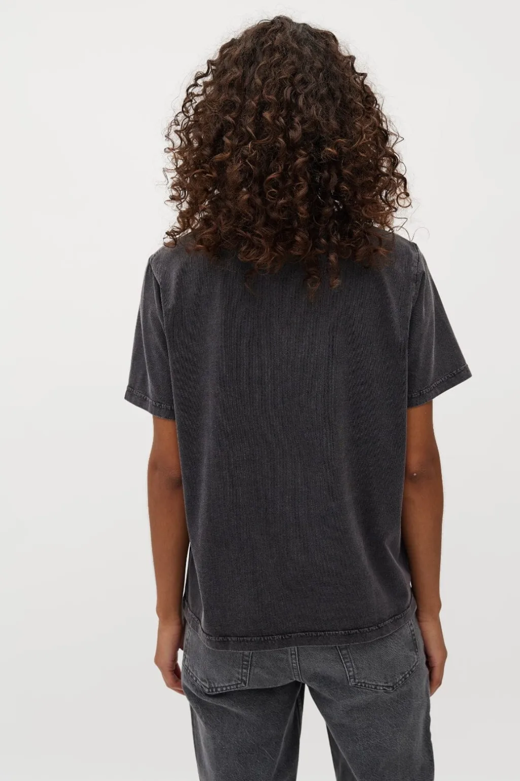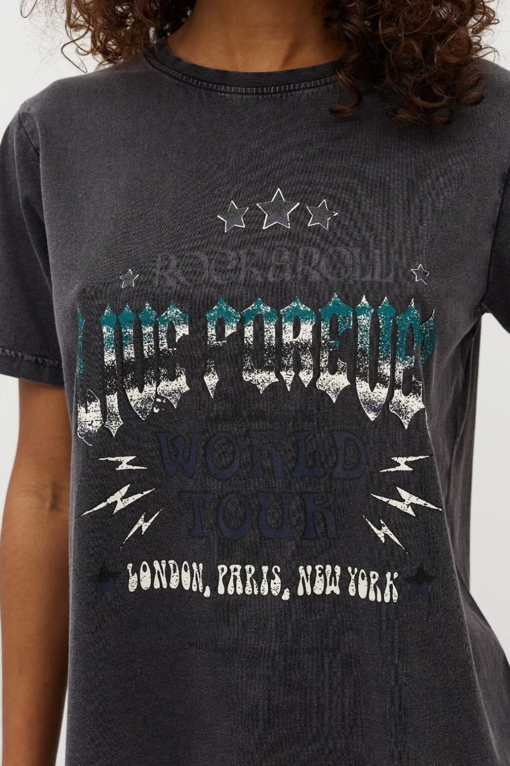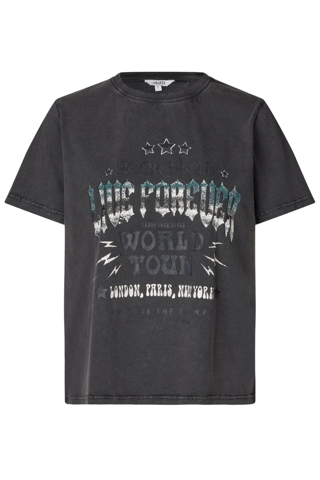 Sort T-shirt fra MbyM med dekorative syninger og pailletter. Printet inkluderer tekst og grafik med acid wash-effekt på forsiden.